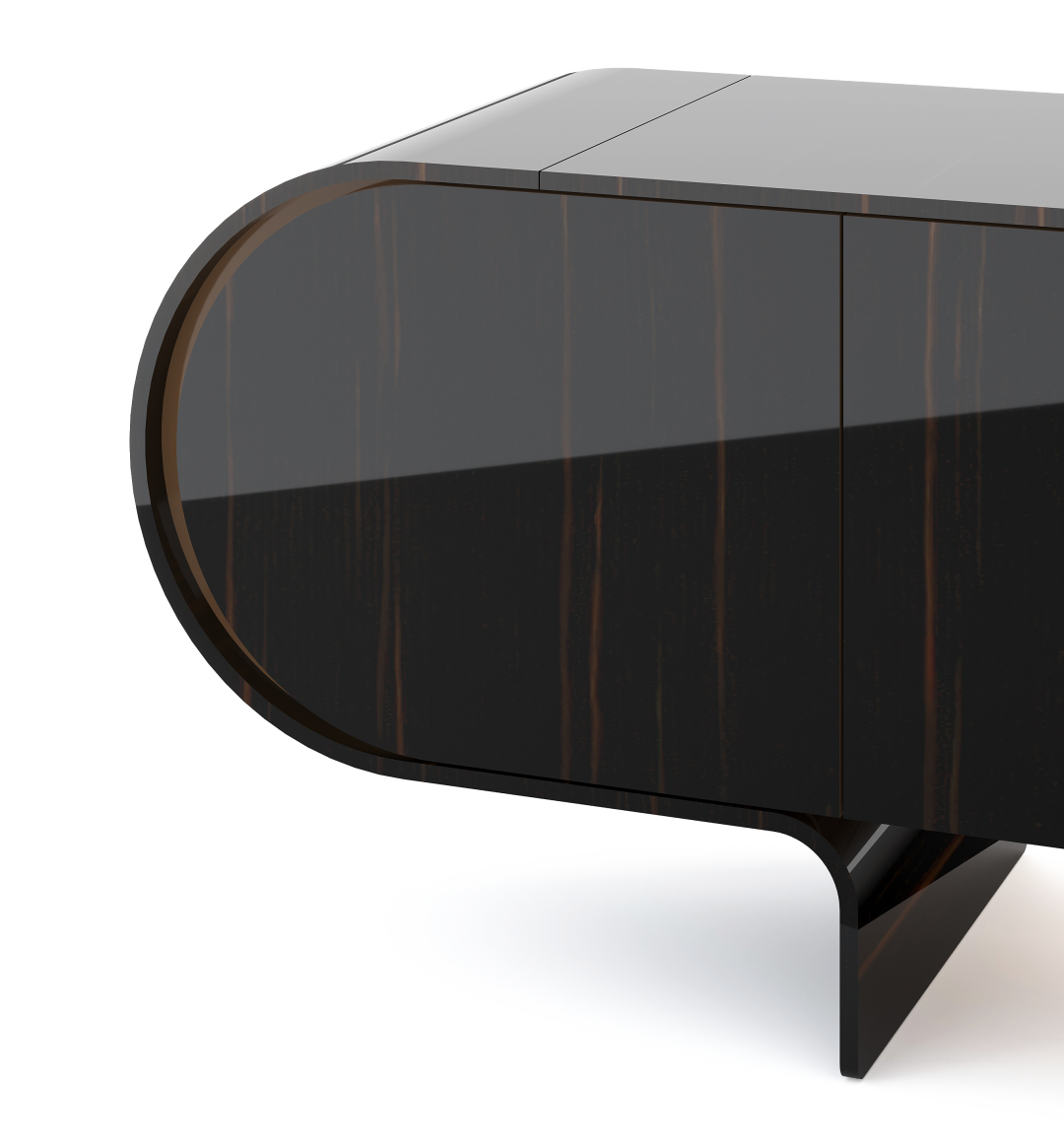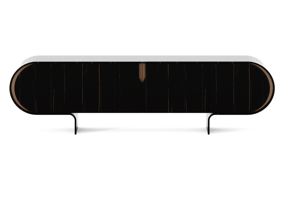圆边柜两侧的就像弯弯的玄月,在暗夜之中神秘示人。Napier 边柜中引人注目的是桉树嵌入式结构,其曲率是通过特定的热处理实现的。边柜的设计尤其强调木材的精工细作,金属、大理石、皮革和玻璃等珍贵材料增添了木工艺的精致性。