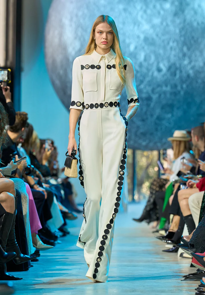 虽然月亮是最初的灵感来源,但Elie Saab 强调,他的主要重点是日常的高级感,无论日夜,美感、舒适度和实用性均非常重要。就如白色牛仔连身裤、百褶裙和适合花园派对的浅色连衣裙。即使是最精致的薄纱裙也经过精心设计,配有口袋,凸显了对实用性的承诺。