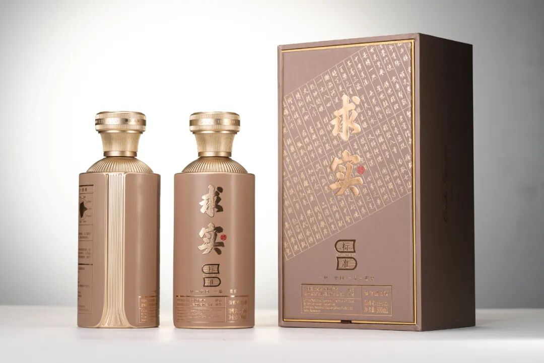 △求实家族2023年11月,求实“宠粉计划”正式实施,求实家族再添新丁。更亲民、更具品质性价比的“求实标准样”产品重磅推出。在价格上,求实标准样处于大众价段位,定位为大众品质酱酒守门员;从包装上,以龙涎金为主色,视觉艺术上尽显华贵气质,契合人体工学的瓶身设计,让人一拿在手里就有“抓金握银”的好彩头;在味觉上,根据用户需求,开创性的采用了轻饮和时尚酒体风格。产品以口感柔和简约、落口生津为突出特点,采用了标准的5年酒体,并在老酒比例上进行了重新调整,更加符合当前入门级酱酒消费人群的需求。