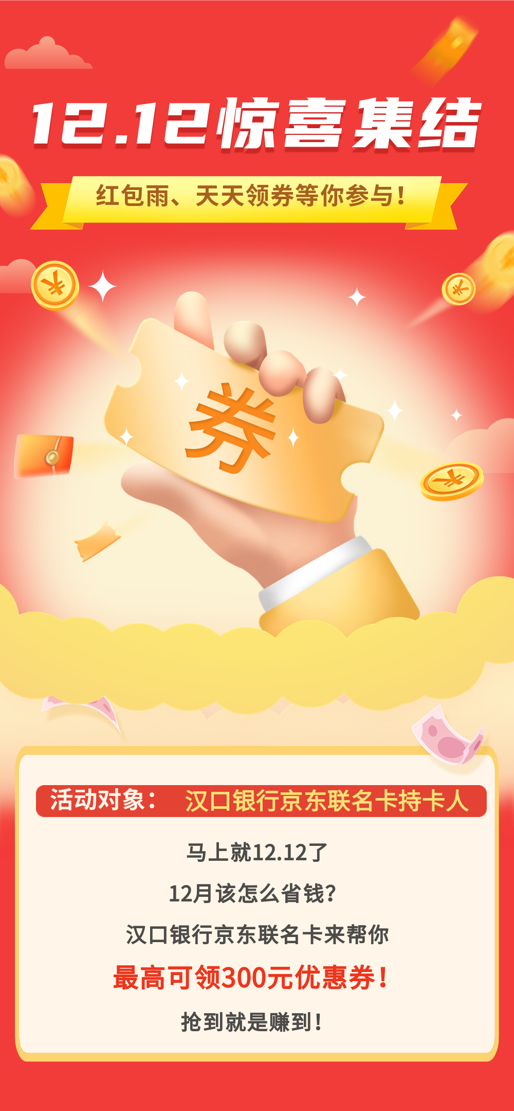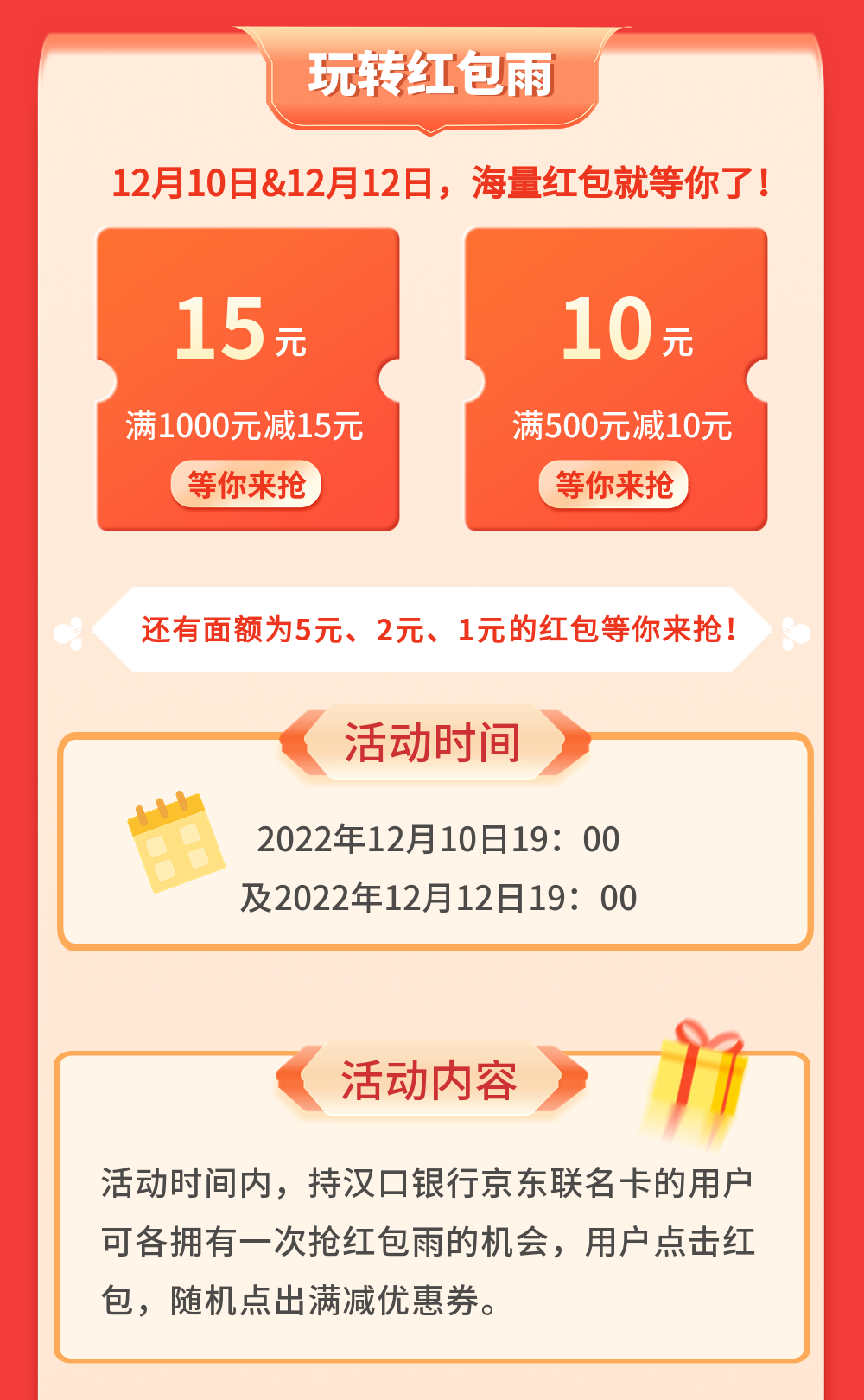 1. 持有上述指定银行京东联名卡的持卡人在12月10日及12月12日指定时间段内可各拥有一次抢红包雨的机会,持卡人需提前激活卡片并绑定京东支付。