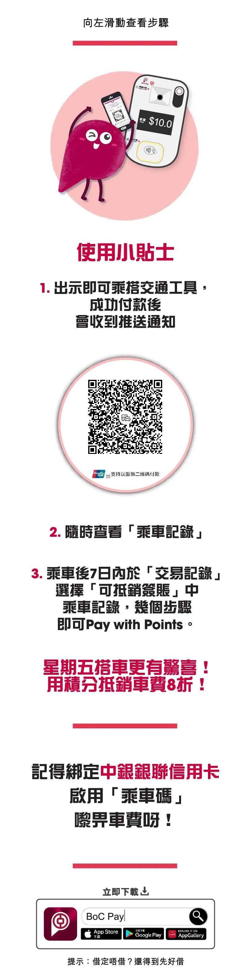 ii. 積分回贈優惠:於推廣期內,每位合資格客戶使用BoC Pay 乘車碼作合資格交易,除可享原有HK$1=1積分外,透過BoC Pay乘車碼支付的合資格交易之總消費金額淨值(扣除所有折扣優惠後的支付價值)可享額外5倍積分,每位合資格客戶於推廣期內額外積分回贈優惠最高上限為5,000積分。