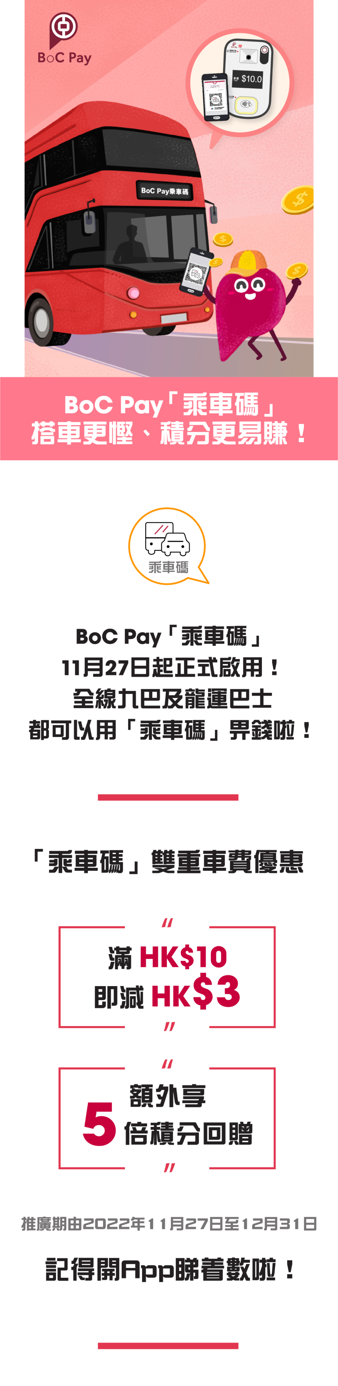 本推廣只適用於BoC Pay流動應用程式 (下稱「BoC Pay」) 綁定於香港發行並印有中銀標誌的中銀銀聯雙幣信用卡 (下稱「合資格信用卡」)之客戶 (下稱「合資格客戶」),於所有支援使用「銀聯乘車碼」的巴士(包括全線巴士服務由九龍巴士(一九三三)有限公司及龍運巴士有限公司所提供)上使用BoC Pay 乘車碼支付車費 (下稱「合資格交易」),合資格交易必須通過銀聯網絡進行方可享以下有關優惠:
