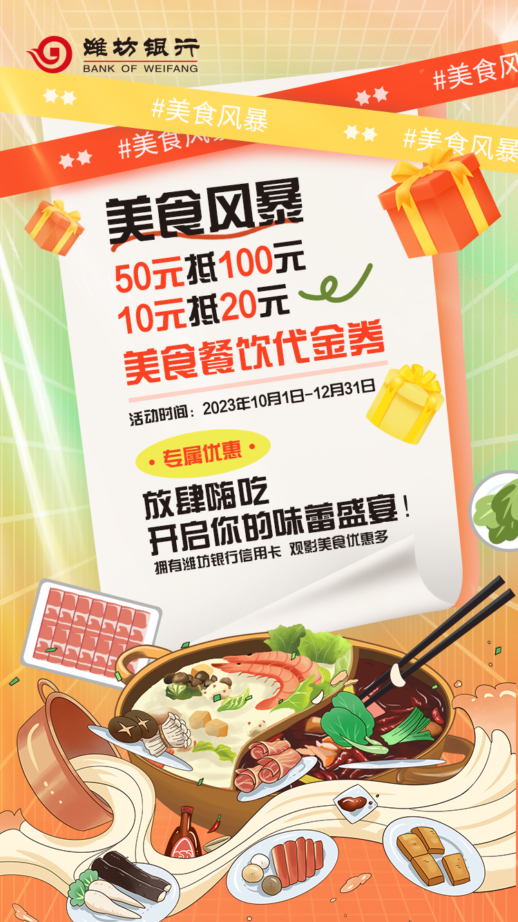 抢购时间限每周五、周六(早9:00开始),登录潍坊银行信用卡公众号优惠中心,每月可抢购50元抵100元美食优惠券2张,10元抵20元餐饮优惠券2张,数量有限,先到先得。(*每种优惠券每个活动日数量限100张。)