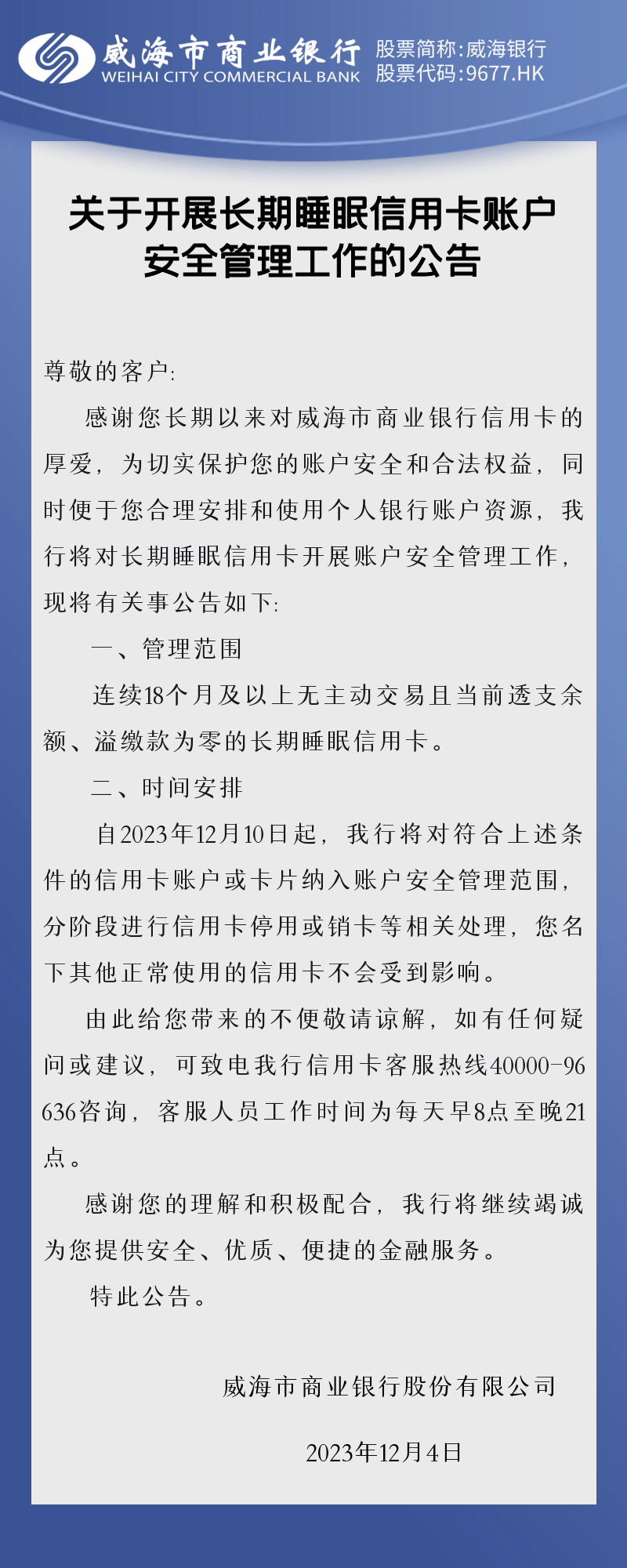 摘要:关于开展长期睡眠信用卡账户安全管理工作的公告