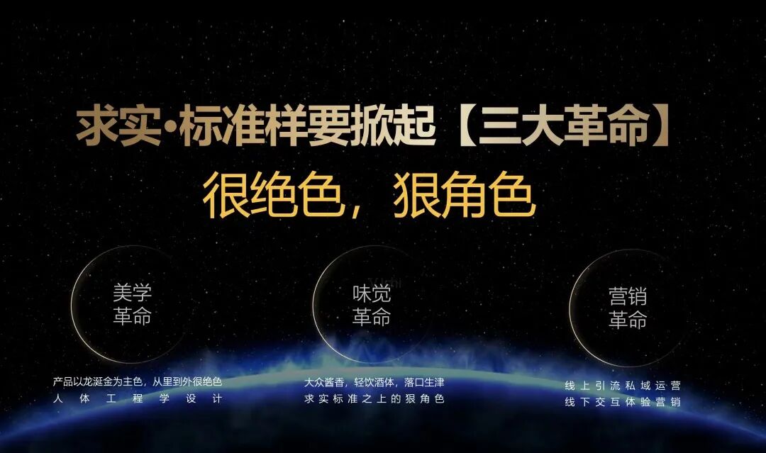 作为一款求实家族的核心新品,求实标准样在视觉设计上以龙涎金为主色调,从内到外都很绝色,尽显华贵气质。这款产品采用了契合人体工程学的瓶身设计,握在手中有“抓金握银”的好彩头。求实标准样在视觉上与求实5年和求实10年形成了鲜明的差异化,也颠覆了大众酱香酒传统的设计理念,释放了求实家族极具个性化的美学态度。