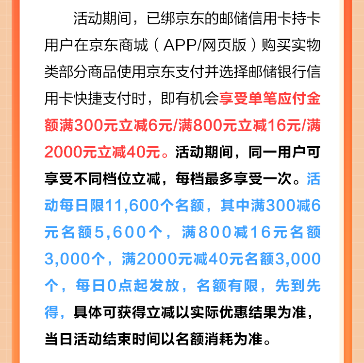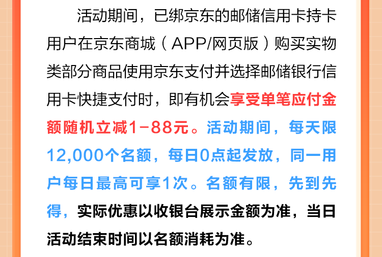3. 本次活动限用户在京东商城(APP/网页版)购买实物类部分商品(特例商品除外)时,选择京东支付并使用邮储银行信用卡完成在线支付(不支持代付类型)时使用,且用户单笔实际支付金额符合活动参与门槛时方可抵扣使用(实际可使用范围以京东收银台实际支持可抵扣交易为准)。