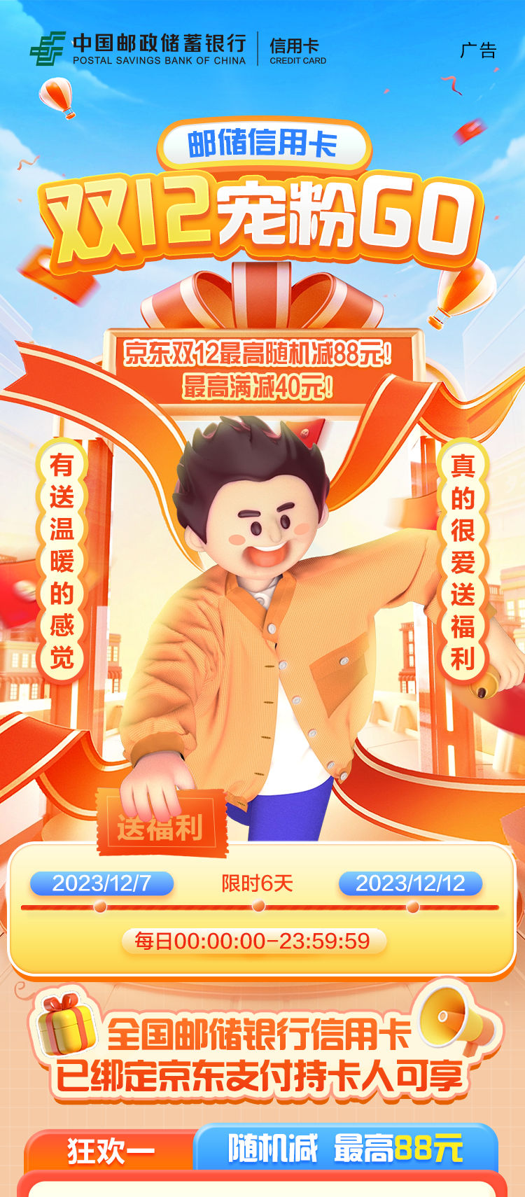 1. 邮储银行信用卡用户绑定京东即有机会参加双十二随机立减活动、双十二支付满减活动。两活动可分别参与。