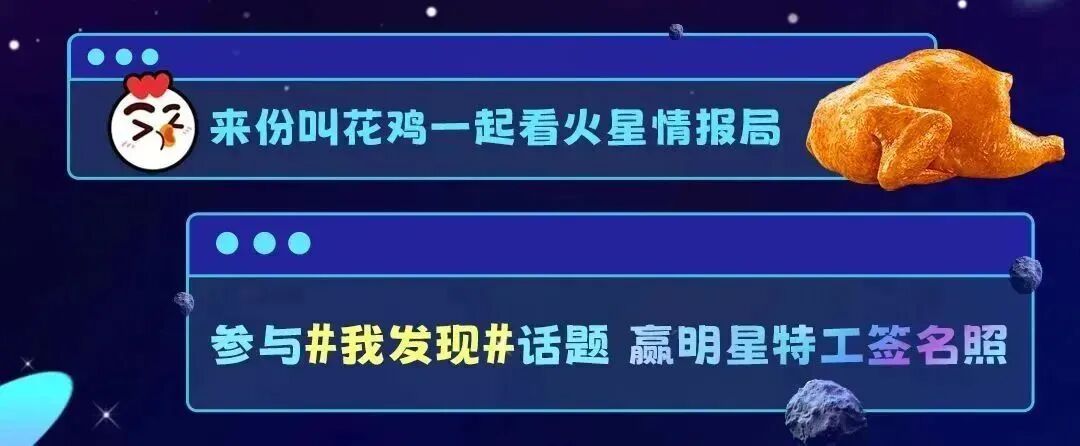【明星签名照】:2023年11月3日至12月29日,参与《我发现》话题分享(每周五12:30更新话题)每周话题点赞第1名的用户将获得火星情报局第六季·明星高级特工签名照一张(随机赠送)。点赞第一名的用户需于2023年12月29日前领奖,逾期视为主动放弃领奖资格。领奖均需进入“Wallce地球联络站”按页面提示填写手机号及地址信息。