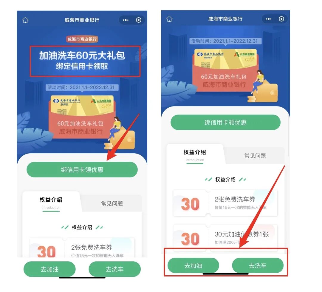 🙌已办卡的点击“绑信用卡领优惠”后,点击“去加油”、“去洗车”立享满减优惠,操作如下图: