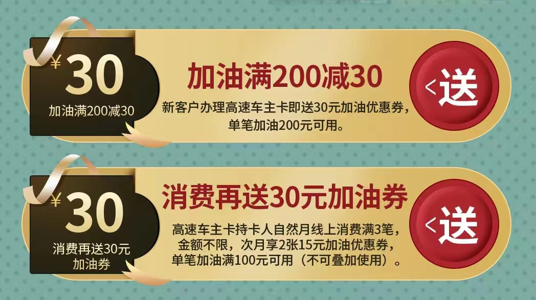 摘要:高速车主卡重磅来袭!新用户加油满200减30,月消费达标再送30元~