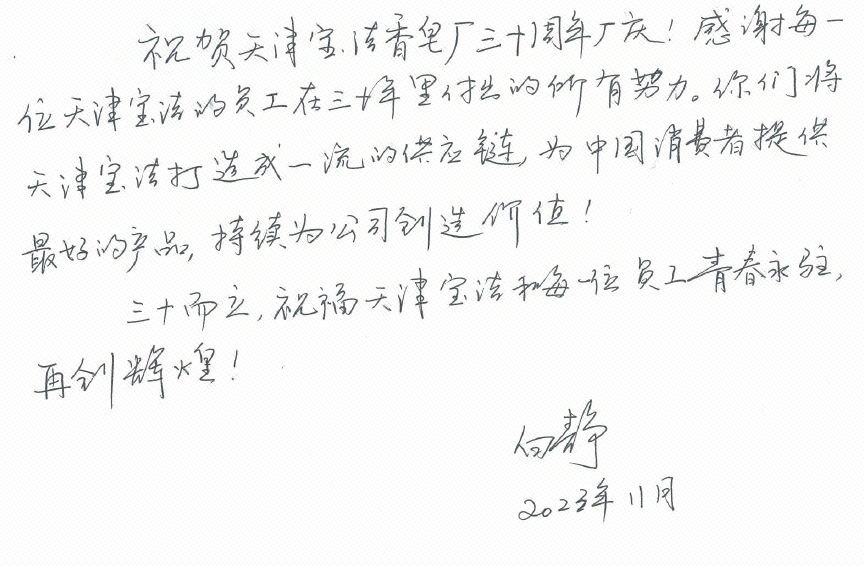 “祝贺宝洁天津工厂三十周年厂庆!三十而立,如今的你们不仅是宝洁健康美肌生意的重要基石,更是全球宝洁香皂制造的旗舰工厂!再次衷心恭喜你们取得的傲人成果,也祝愿天津厂不断追求卓越的供应链能力,创造更多生意和组织的辉煌!”