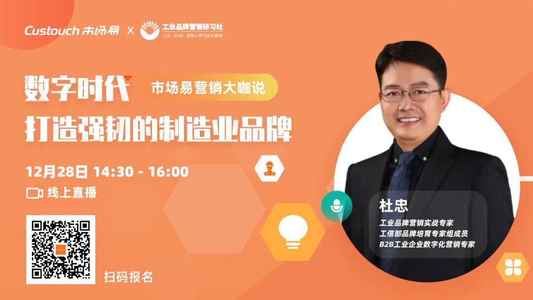 为此,年末我们与制造业品牌营销“布道者”杜忠老师相聚Custouch市场易“营销大咖说直播间”,共话如何打造品牌韧性。