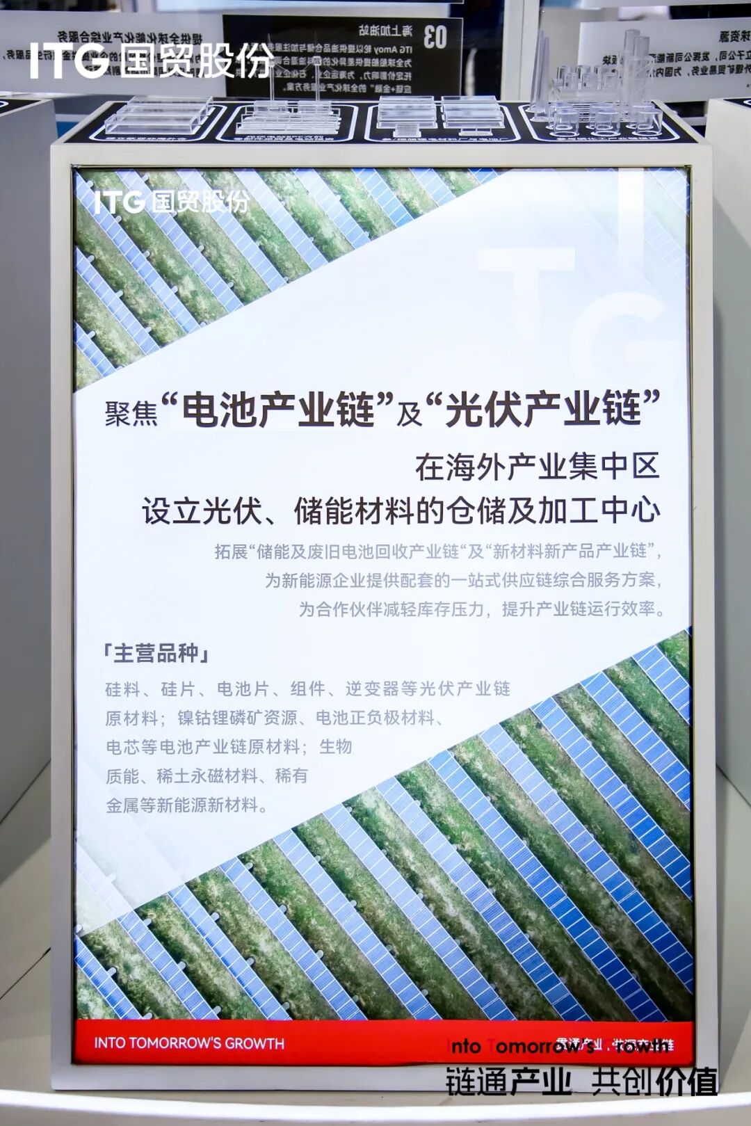 此次链博会上也展出了国贸股份新能源产业链的服务案例。作为国贸股份着力打造的新增长曲线,新能源产业聚焦“电池产业链”及“光伏产业链”,为光伏零部件及电池材料的生产企业提供定制化解决方案,参与磷化工供应链整合;计划设立光伏、储能材料的海外仓储及加工中心,为合作伙伴降低生产成本。