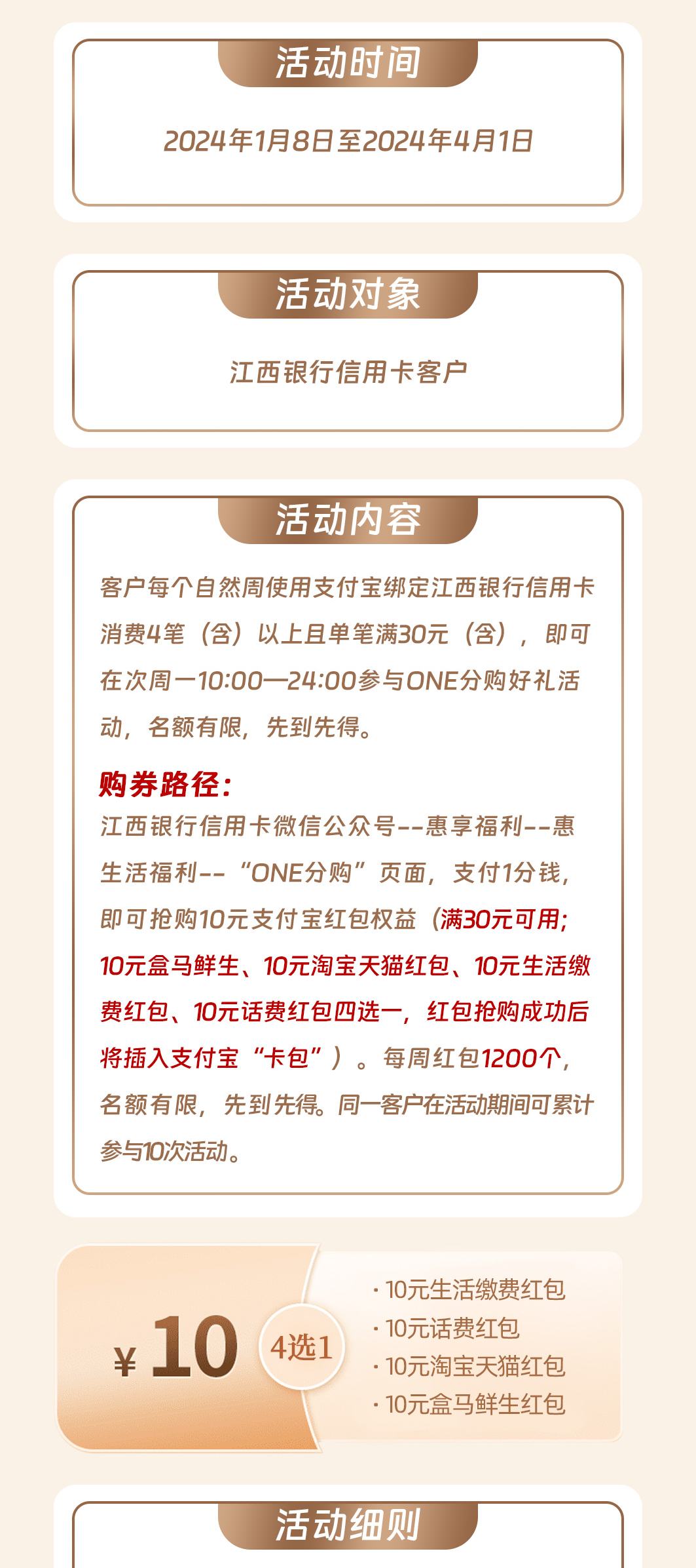 2、10元支付宝红包权益在抢购后7天有效,客户持有该红包在消费时通过江西银行信用卡使用支付宝结算可享受满30元减10元优惠,具体使用以支付宝页面显示为准。