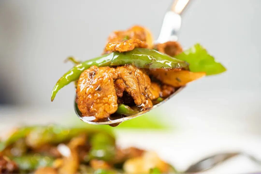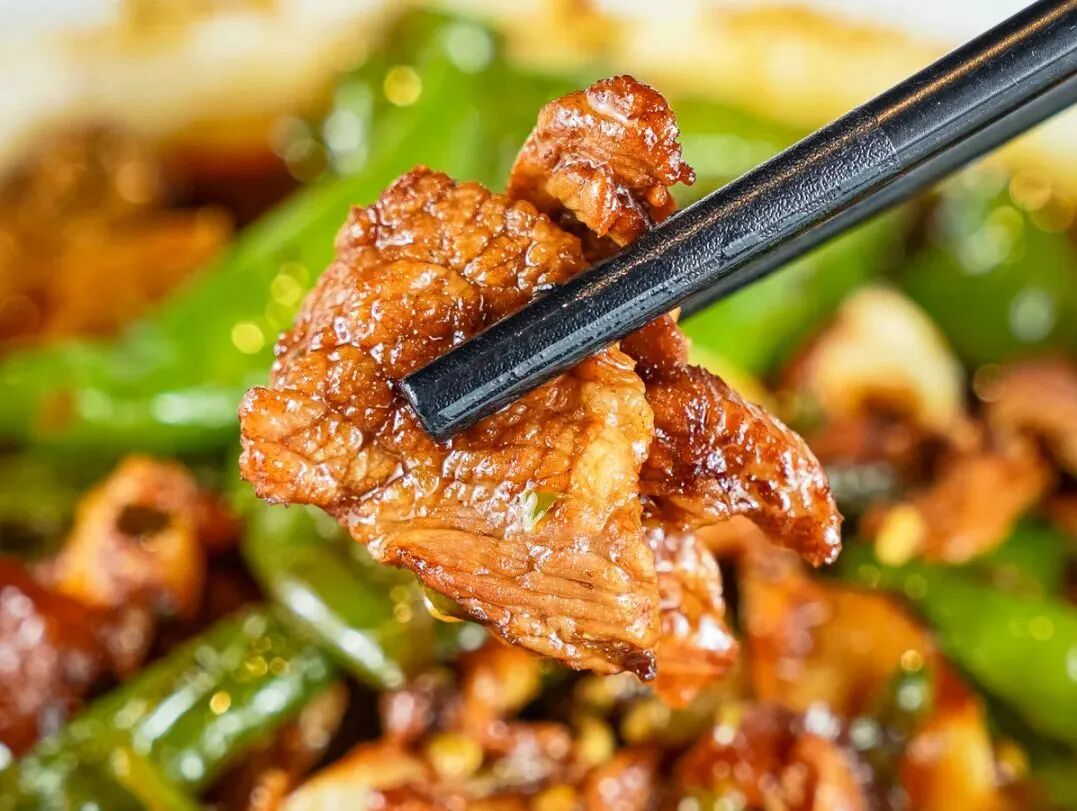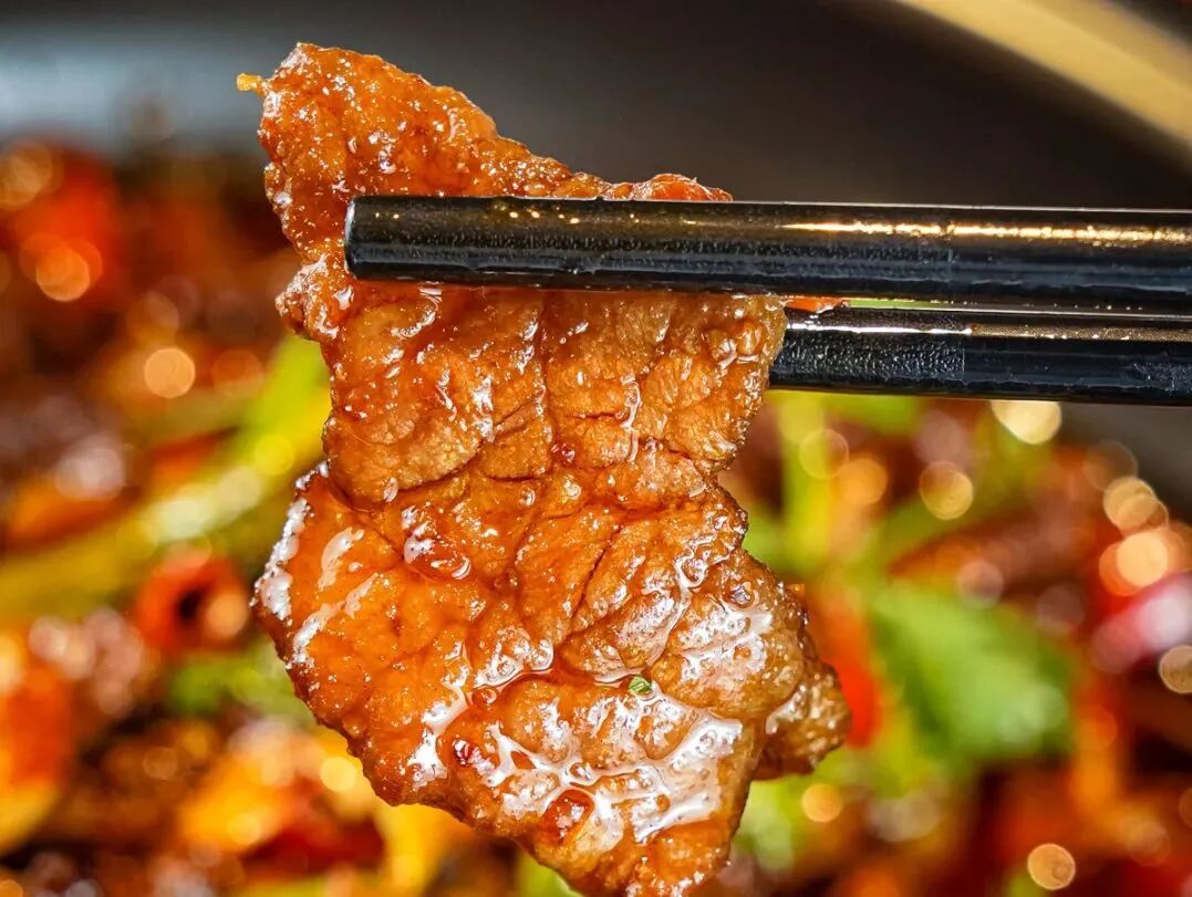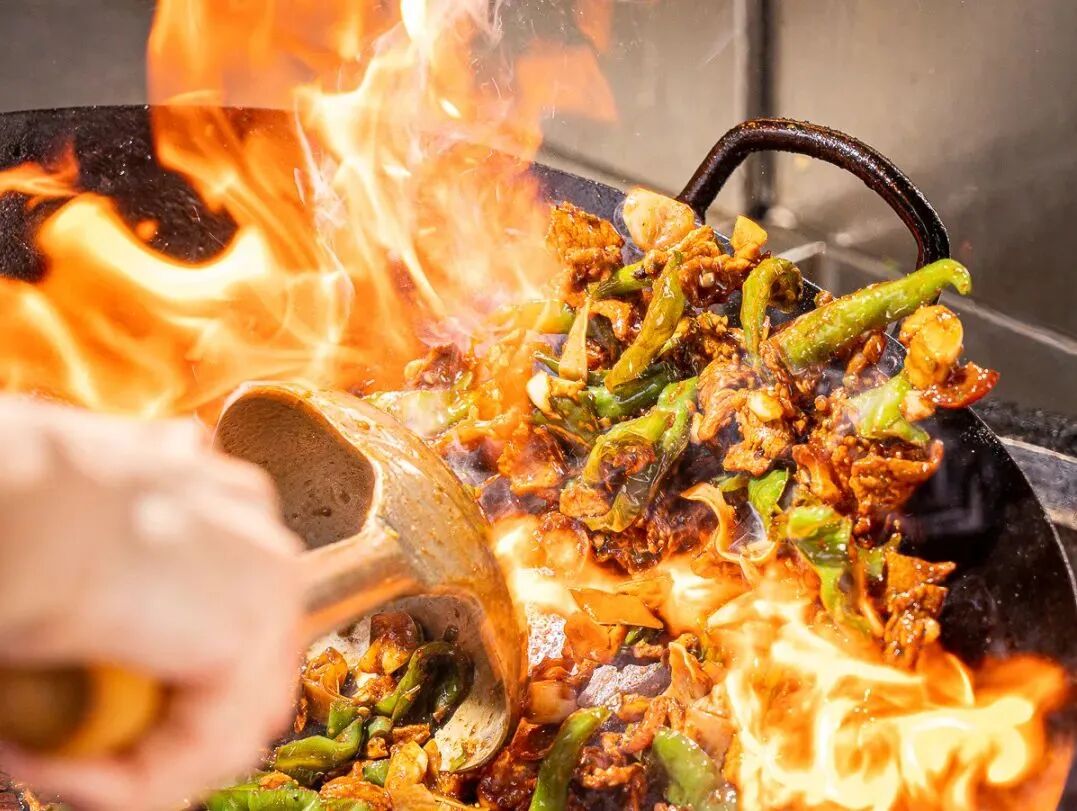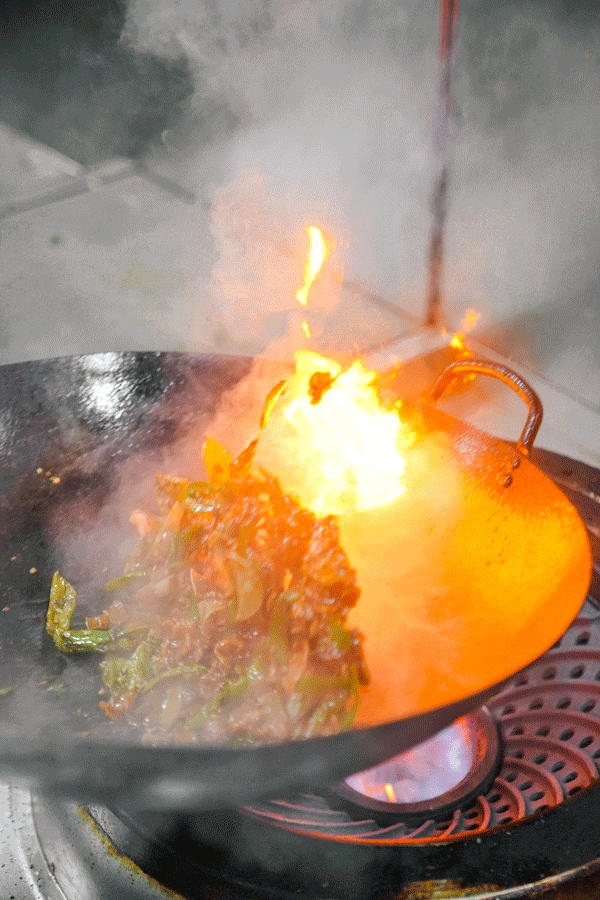 烟火升腾后,大火炒出的浓郁肉汁包裹着辣椒,