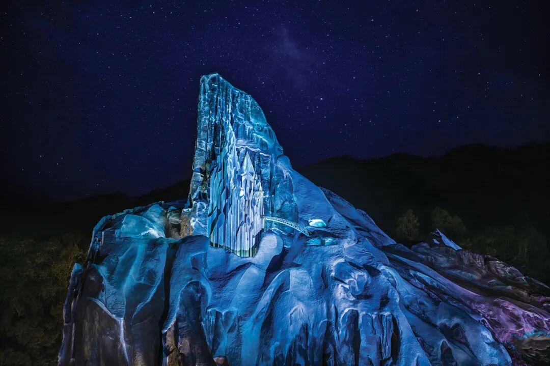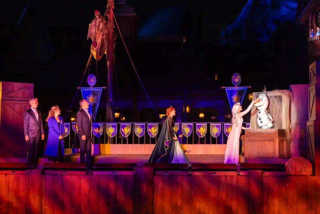 盛典在魔雪奇缘世界里的阿伦黛尔港举行,艾莎现场展示了冰雪魔法,并召唤雪宝现身,唤醒阿伦黛尔王国的生机活力!在一声声震撼声和欢笑声中,一众宾客在阿伦黛尔的迷人夜空下享受了一场盛大的夜空派对!