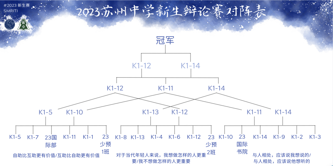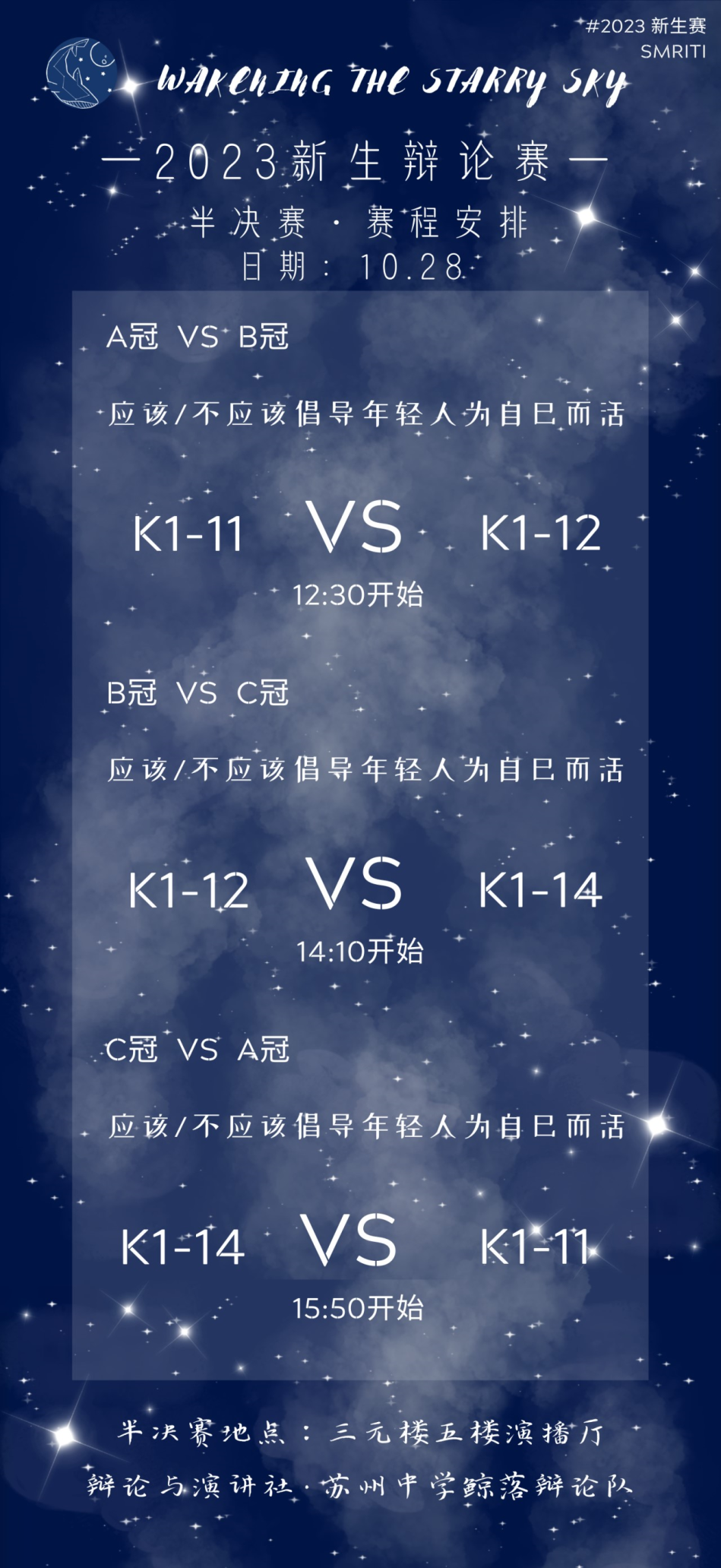 赛事组织者、“辩论与演讲社社长”陈晞怡同学谈道:“赛制上加入了首质的环节,改善四辩边缘化现象;而赛程上则选择了小组循环-单淘-小组循环-冠亚决赛的方式,进一步提高赛事效率,同时给予同学们充分学习和试错的机会。另外,我们还致力于提升讨论内容的深度和广度。例如我们选择了更聚焦“年轻人”关注点的辩题,让大家能做到纵观生活,俯仰皆是,推开新生赛这一扇绣闼,让思辨之光照亮每个人的生活。”