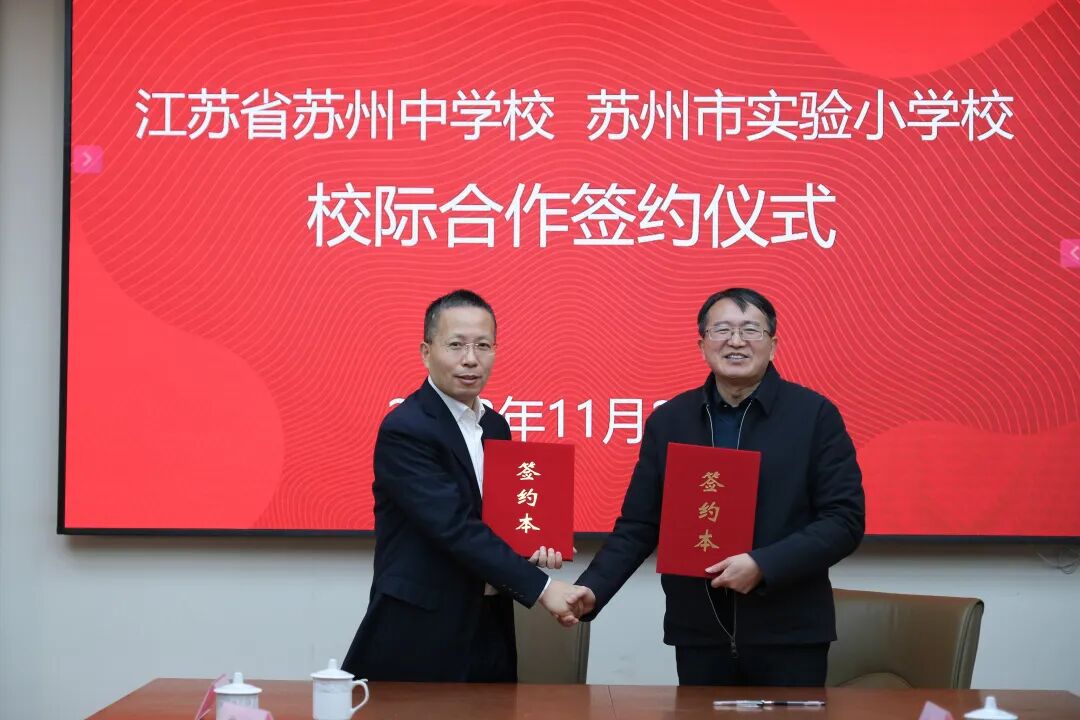 揭牌仪式过后,在教育局领导和两校领导班子的共同见证下,江苏省苏州中学与苏州市实验小学校签署校际合作协议书。在未来,两校将以更高的站位、更强的使命感、更好的执行力、更科学全面的学生观,开展合作交流和拔尖创新人才贯通培养实验,努力打造新时代高品质的教育合作样板。