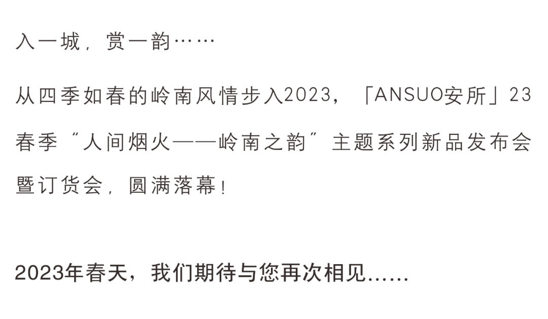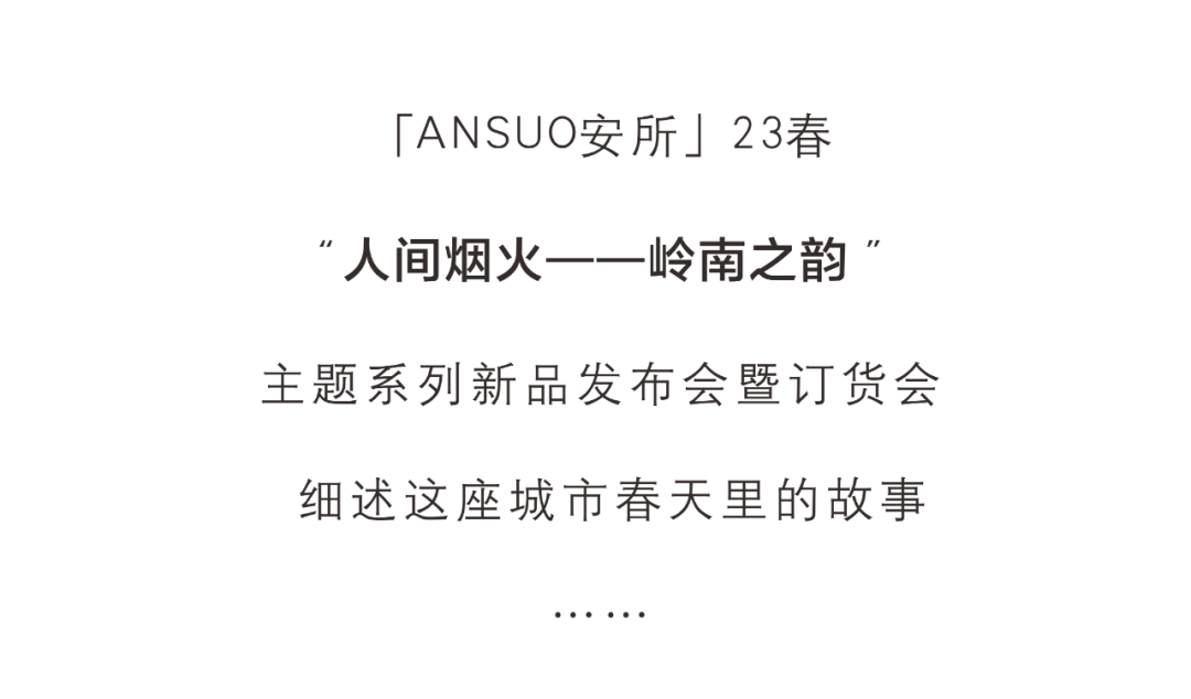 摘要:入一城,赏一韵……\x0a从四季如春的岭南风情步入2023,「𝐀𝐍𝐒𝐔𝐎安所 」23春“人间烟火——岭南之韵”主题发布会暨订货会,圆满落幕!