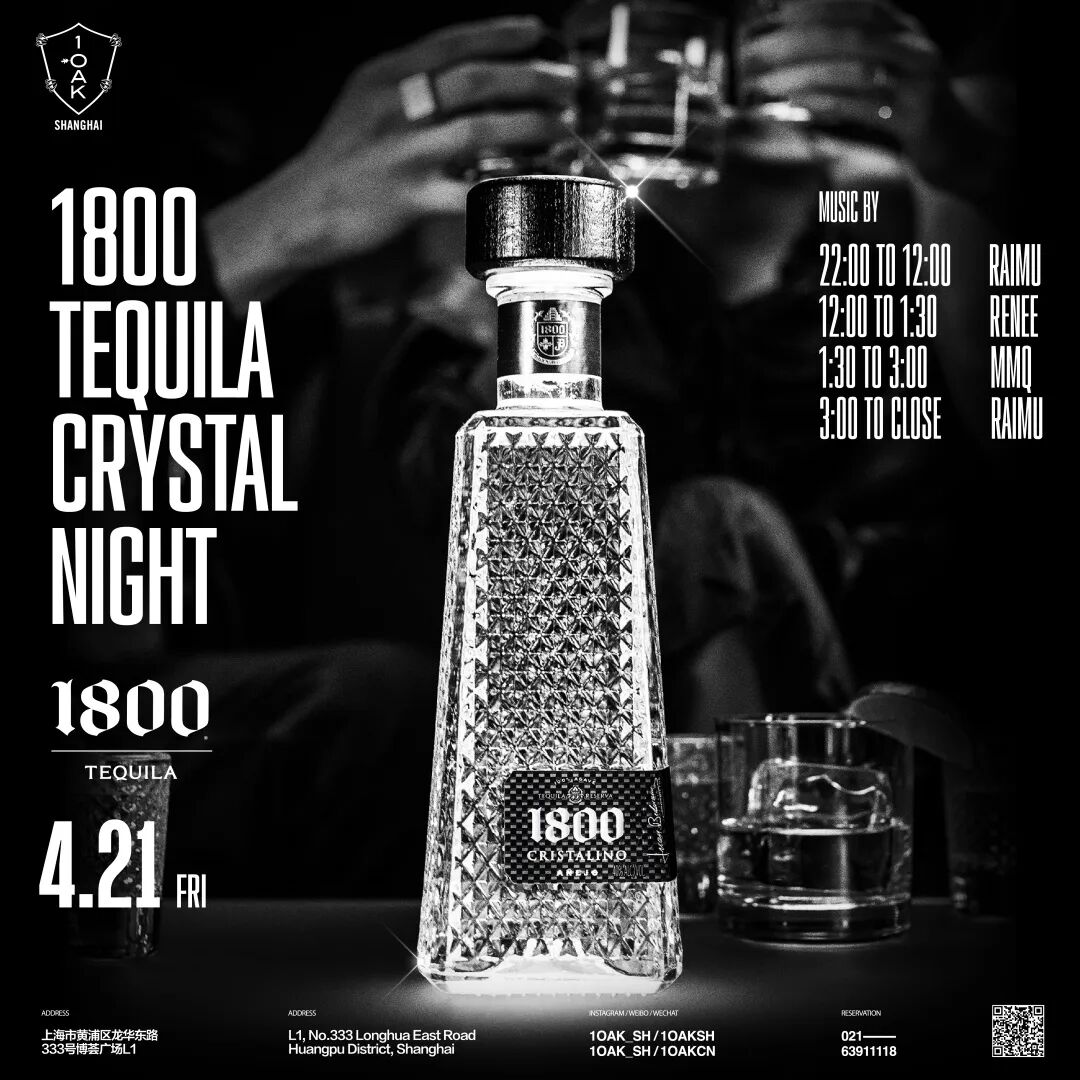 On the journey of pursuing quality and music, 1 OAK and 1800 TEQUILA have joined forces. Coinciding with the reopening of 1 OAK Shanghai, we are delighted to present the 1800 TEQUILA CRYSTAL NIGHT party. We hope to offer you a night of relaxed enjoyment! See you at 1 OAK on April 21 st!