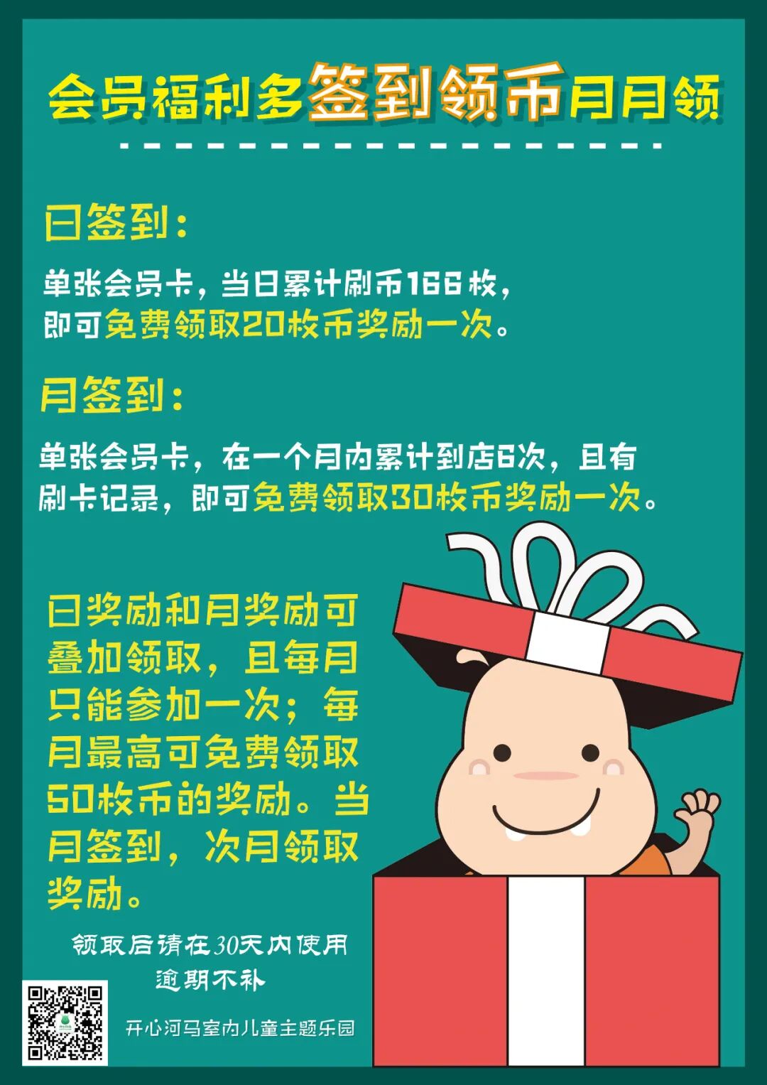 1.首次关注开心河马合肥旭辉店抖音,凭会员卡到店充值5枚币,单张卡限领一次;