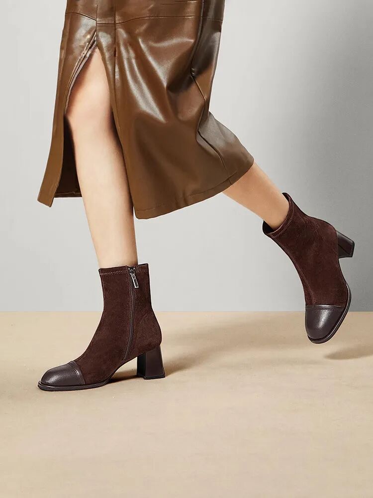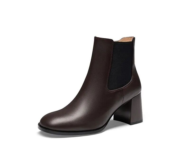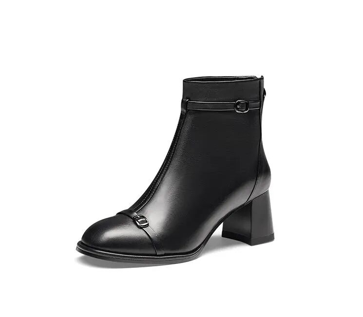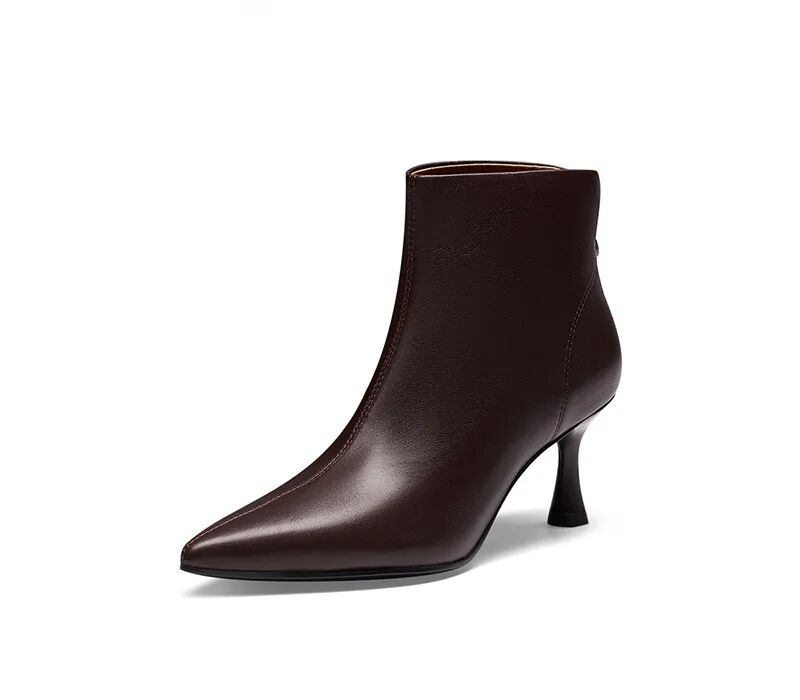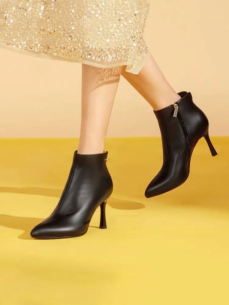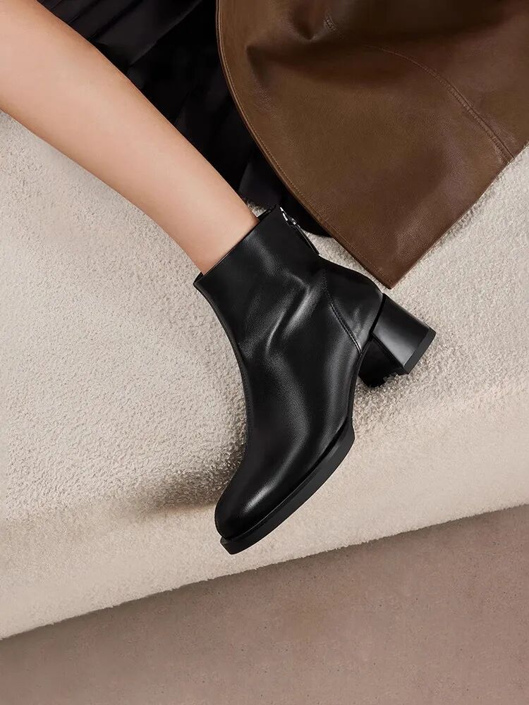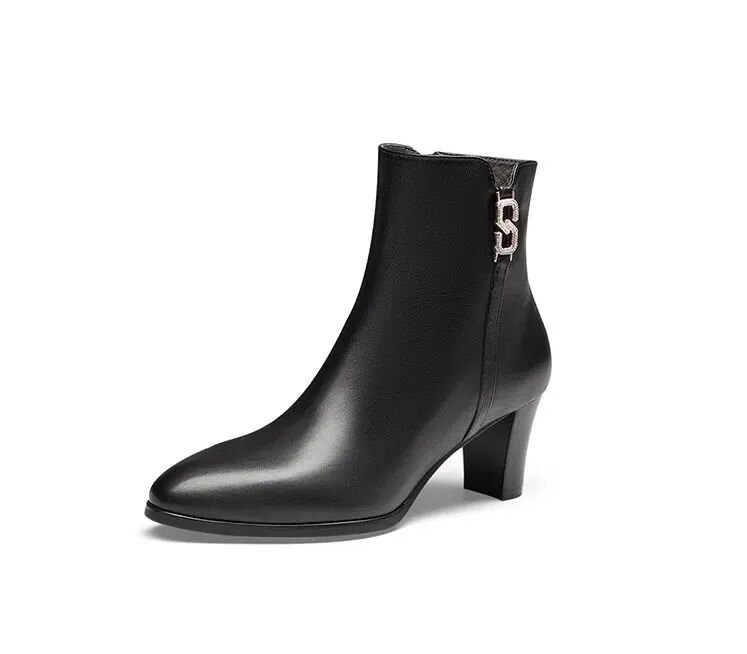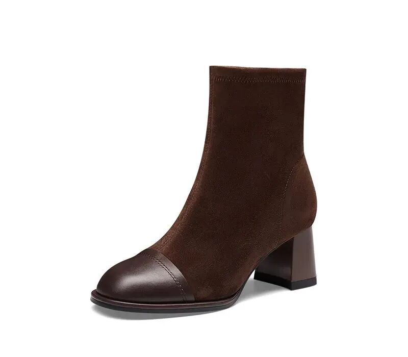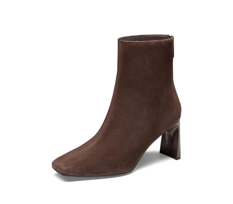 ▲牛皮粗跟高跟靴弹力短靴¥1799,折后价¥899