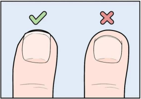 2. 避免过度修剪指甲,两端测角应剪成方形而非半圆形,避免擦伤甲皱襞引起甲沟炎;