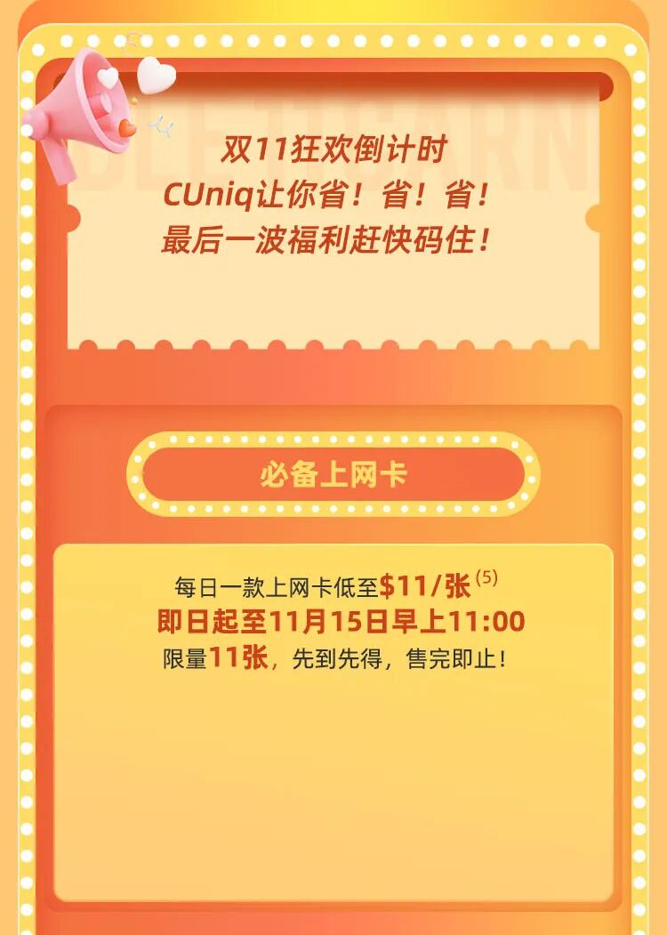 (5)双11优惠期间,客户经指定双11优惠页面以双11限时优惠价(每张$11)购买指定储值卡一张。每日指定一款储值卡限时优惠价$11,指定一款储值卡将于每日早上11:00开售至当日23:59。每款限时优惠价的储值卡数量11张,售完即止。指定储值卡享双11限时优惠价。每张订单仅限购买一张双11限时优惠价$11的储值卡,惟可加购其他非双11限时优惠价的储值卡于同一订单中。双11限时优惠价$11储值卡不适用于eSIM。