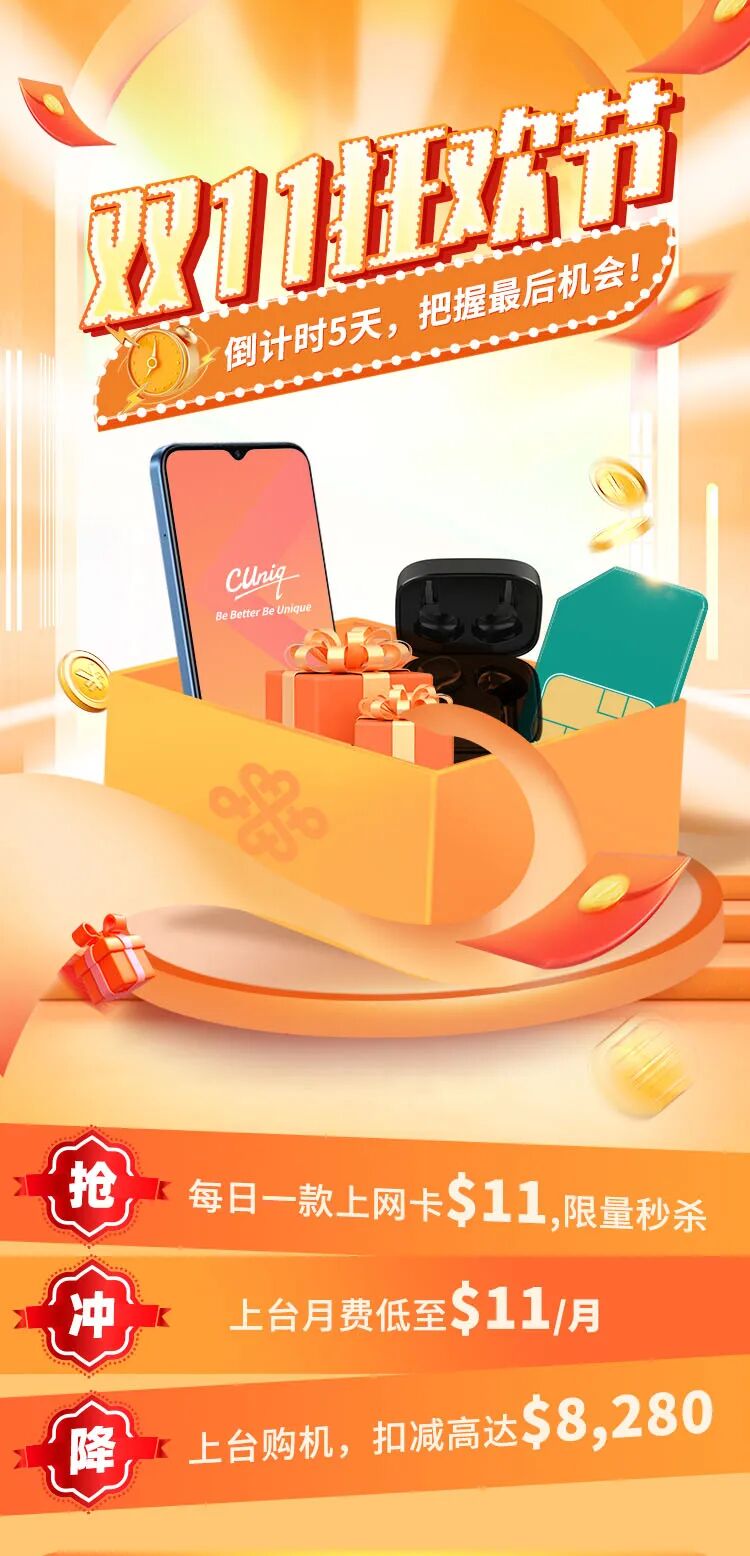 (1)双11优惠推广期由2023年11月1日至11月15日 (香港时间)。双11优惠期间,客户经网上商城、MyCUniq APP或门市申请24个月合约期之5G本地数据无忧计划(50GB),即可享24个月月费$111。经网上商城、MyCUniq APP上台之客户每日申请限额11位,售完即止。优惠不可与其他优惠同时使用。