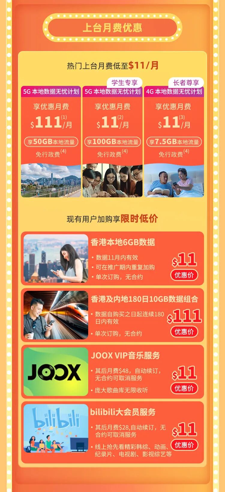 (3)双11优惠期间内,年满60岁合资格客户可经网上商城、MyCUniq APP或门市申请24个月合约期之4G本地数据无忧计划(长者优惠),其中6个月月费$11,其他18个月月费$38。经网上商城、MyCUniq APP上台之客户每日申请限额11位,售完即止。合资格客户须于登记服务时已年满60岁,并须出示身份证明文件以作证明。优惠不可与其他优惠同时使用。受相关产品条款及细则约束。