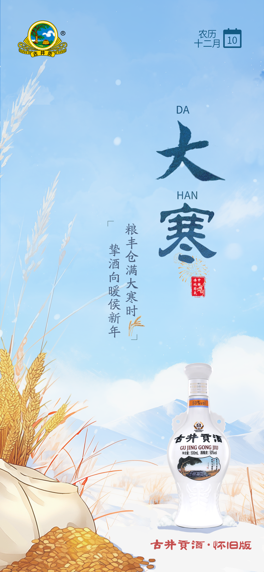 冬虽寒,酒却暖。酒的暖,暖在人的心上,囊括很多无以言表的情长。春节代表着中国人对家的牵绊,也承载着许多难忘的新年味。喜庆的年画、糖果、春联,备齐年货、尝口腊肉、走亲串友,年勾起归乡之欲,一瓶好酒寄托情感,冬天好像就在这样一场家的故事中与冷意剥离,让人时常放不下这种美酒与美食交织出来的香与浓。大寒至,年愈近,归心似箭,携一壶古井贡酒怀旧版,新年定要许一杯溢出来的圆满。