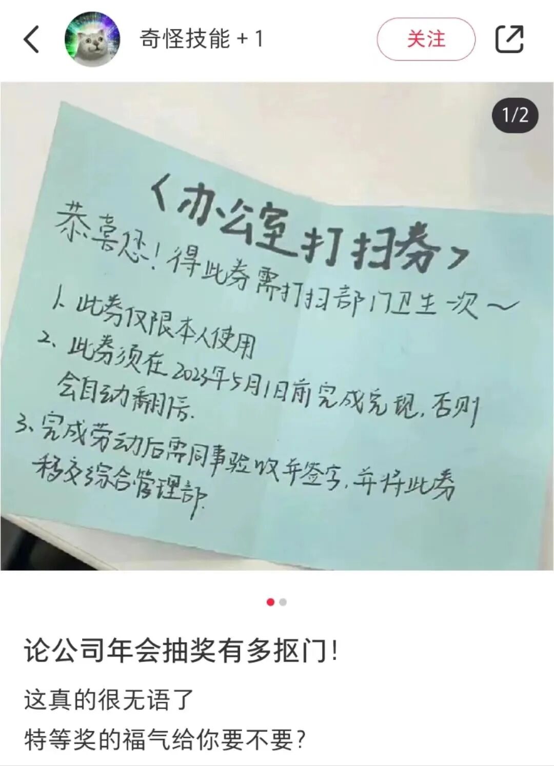 @奇怪技能+1 抽中一张办公室打扫券,得此券需打扫部门卫生一次,且若未如期完成,将自动翻倍,让她直呼:这福气给你要不要啊?