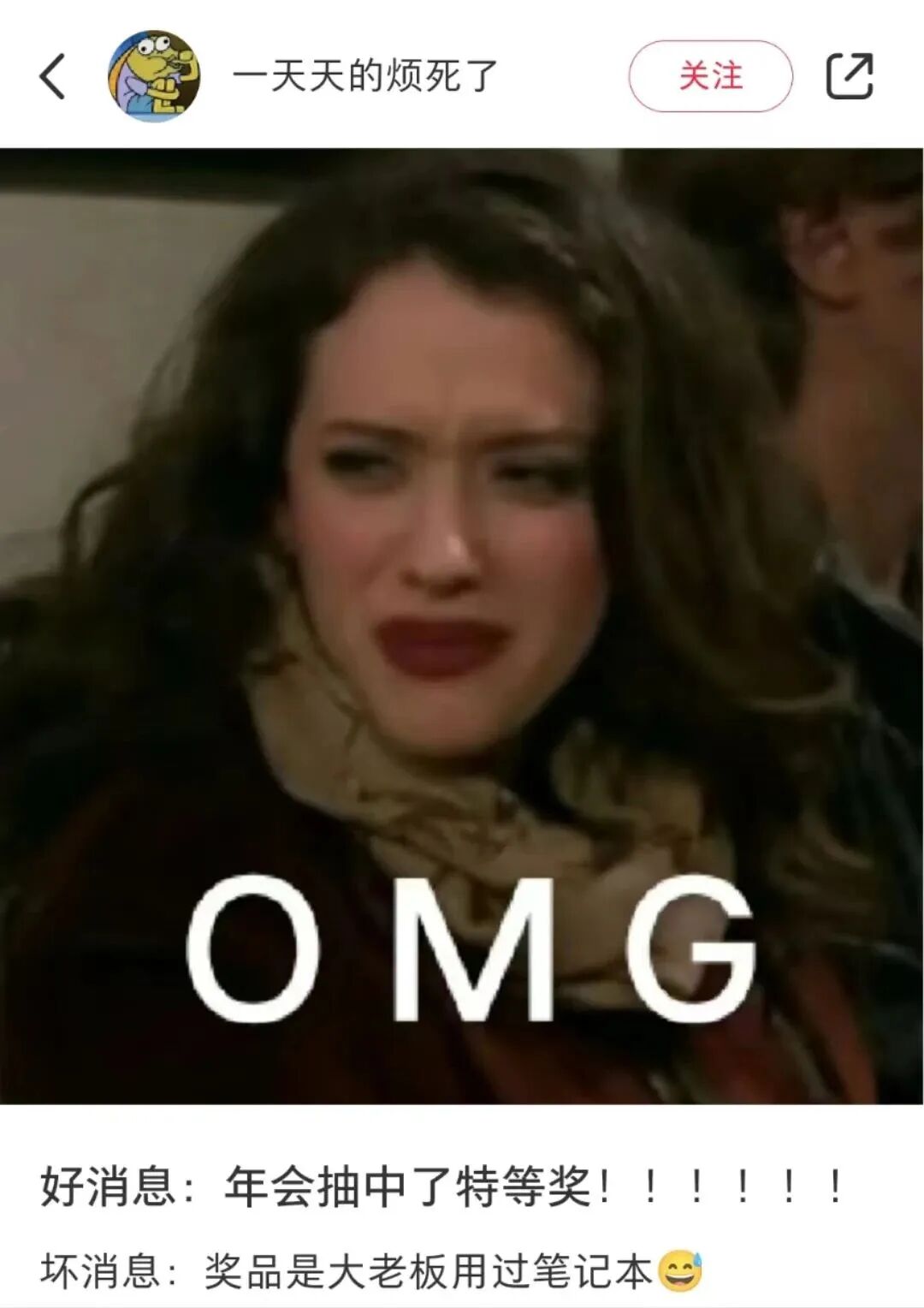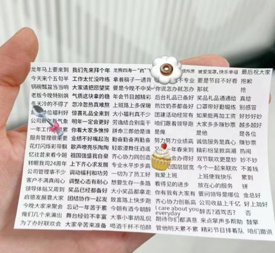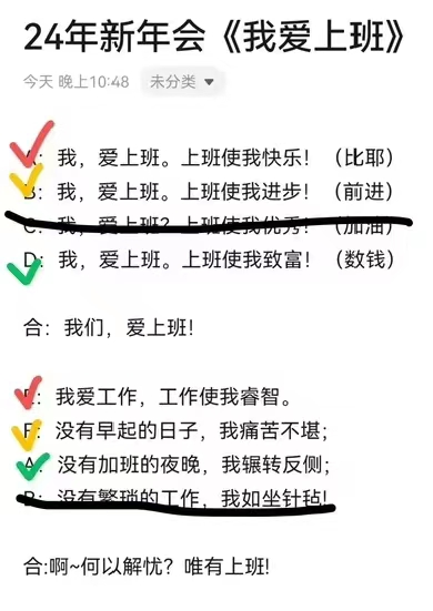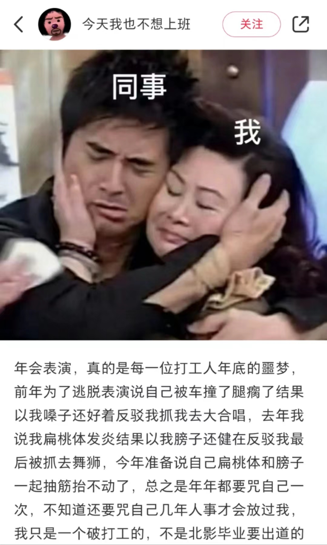 @今天我也不想上班 在年会请假上可谓百折不挠:2021年,她说自己被车撞了腿瘸了,不能跳舞,然而被抓去合唱;去年,她说自己扁桃体发炎,不能唱歌,结果被抓去舞狮;今年,她准备对自己更狠点儿,直接说自己扁桃体和膀子一起抽筋抬不动了……