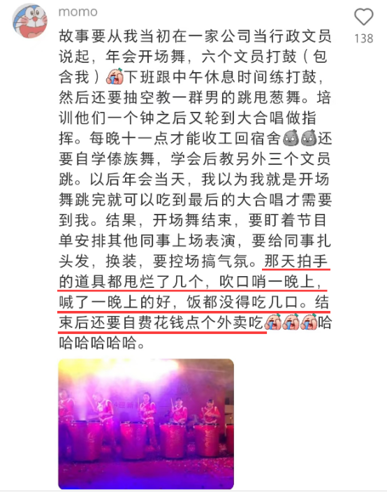 小红薯@momo 深受公司省预算之害,不仅自己要上台打鼓,还兼指导、服装、控场于一身,「道具甩烂,叫好一晚」,结束后还要自费点外卖吃。