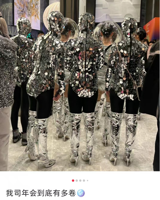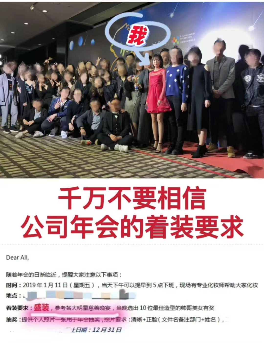 小红书网友@罗伯特烦恼 更是在年会上创造了独属一个人的尴尬。公司邮件写明了年会的着装要求:「盛装,参考各大明星慈善晚宴」,但当她真的精心装扮,才发现自己成了「万黑丛中一点红」。