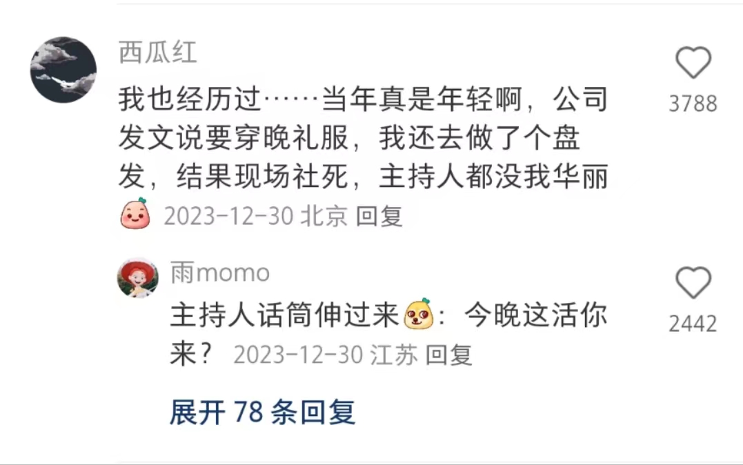 @西瓜红 与她有着相似的经历,做了盘发、穿了晚礼服的她,比年会主持人还要华丽,结果就是「当场社死」。
