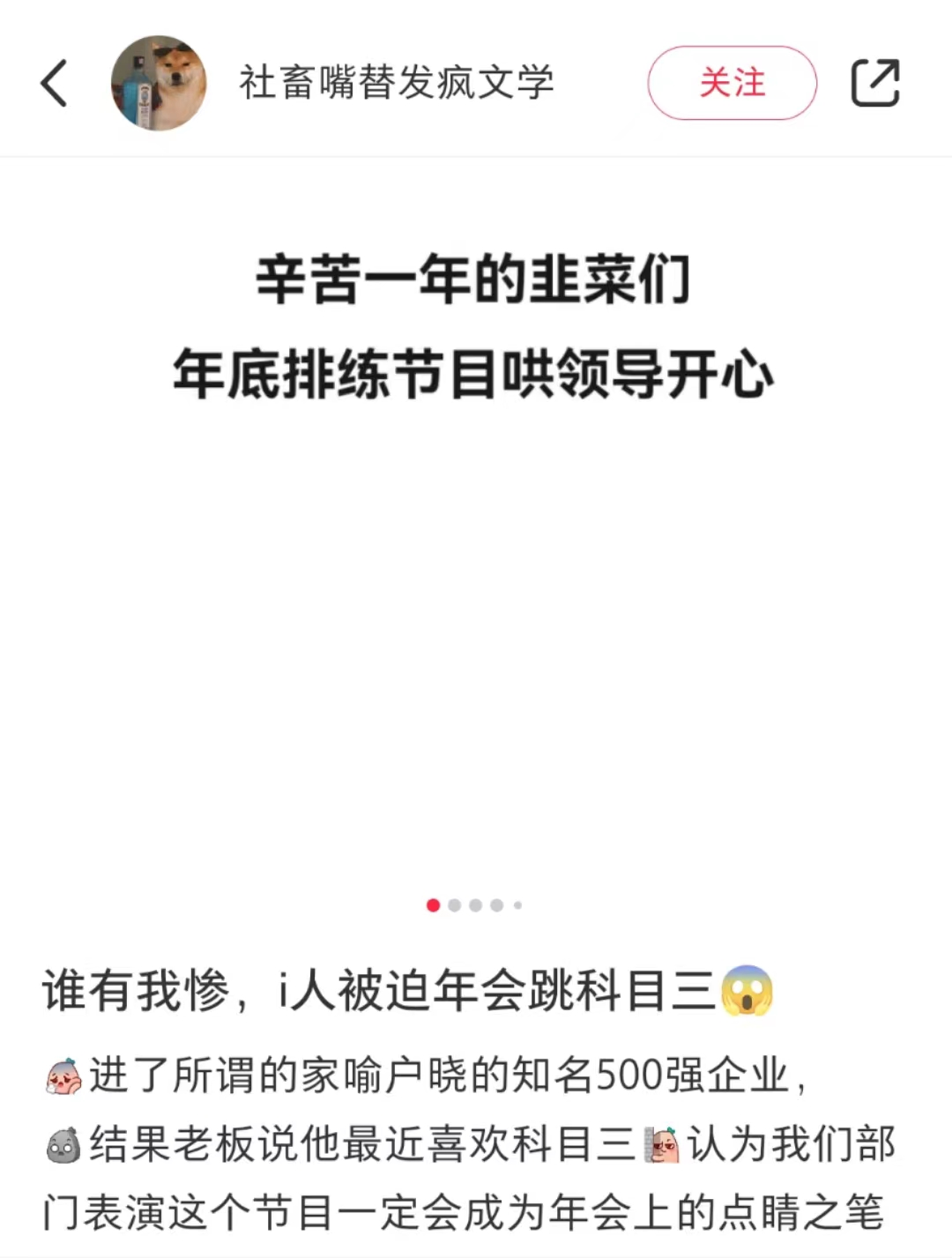 @社畜嘴替发疯文学 火力全开,吐槽领导喜欢的年会汇聚了时下热梗、煽情小品、各类神曲以及男扮女装的「搞笑」节目。身为i人的她自己也难逃老板喜欢的科目三,「无法想象社恐的自己会如何站在舞台上摆弄不怎么灵活的身体。」