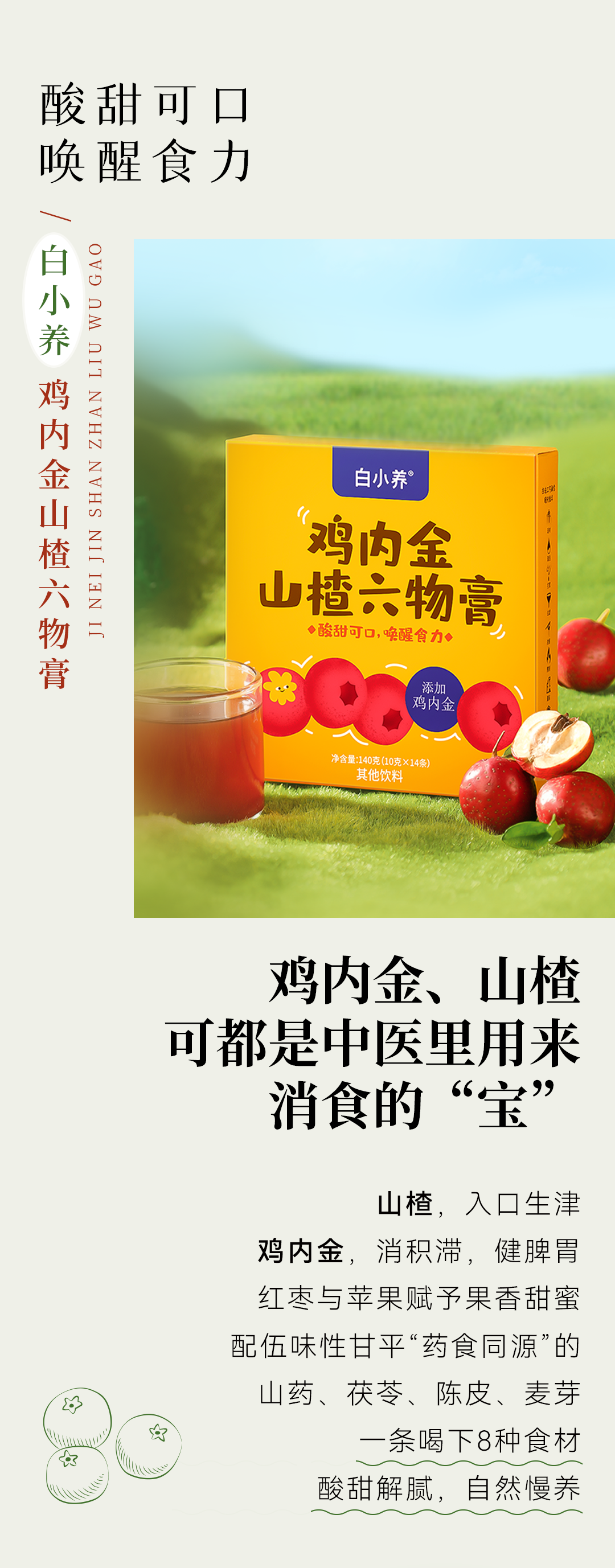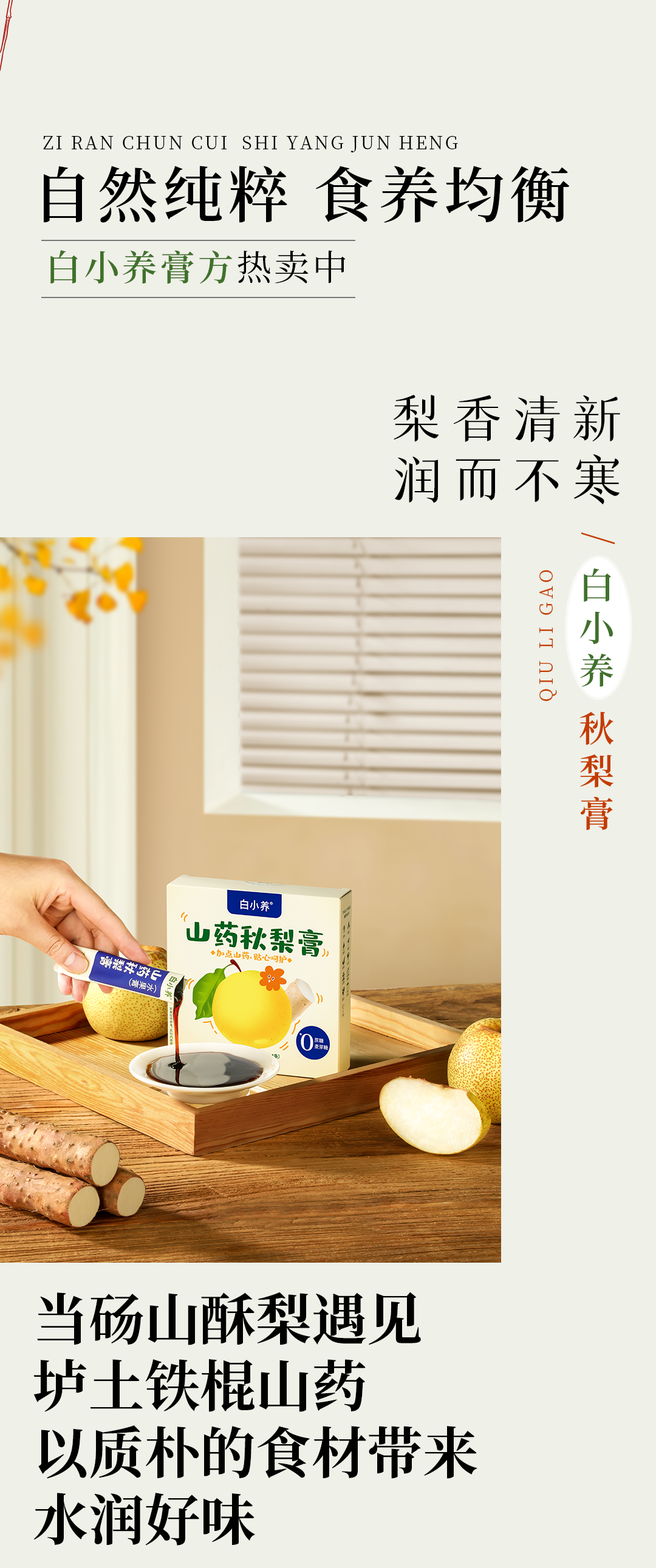天人合一 食愈轻养白小养膏方新系列茯湿放晴,一饮清盈白小养五指毛桃茯湿膏“十大云药”云茯苓,让身体重获轻盈感。《滇海虞衡志》:“茯苓,天下无不推云南,曰云苓。”云茯苓作为核心原材,并以宋《太平惠民和剂局方》二陈汤为组方灵感。高阶复配14倍浓缩,一扫疲态昏沉,解锁轻松奥义。南国神草,百草之王白小养三七人参膏人参、三七、云南重瓣玫瑰,找回内在向上力量。“北人参、南三七”,选取人参、三七配伍云南重瓣玫瑰,共奏和煦与舒缓和谐乐章。以宋《太平惠民和剂局方》十全大补汤为组方灵感,元气充盈,能量加满,喝出活力红润少女感。自然纯粹 食养均衡白小养膏方热卖中梨香清新,润而不寒白小养秋梨膏当砀山酥梨遇见垆土铁棍山药,以质朴的食材带来水润好味。每盒白小养秋梨膏要用掉7斤鲜梨,15个小时的熬炼,将真材实料凝练成为晶莹丝滑的梨膏。甜润的梨膏水,及时补充水分赶走燥气,好味道点亮一整天的愉悦心情!酸甜可口,唤醒食力白小养鸡内金山楂六物膏鸡内金、山楂可都是中医里用来消食的“宝”。山楂,入口生津;鸡内金,消积滞,健脾胃;红枣与苹果赋予果香甜蜜;配伍味性甘平“药食同源”的山药、茯苓、陈皮、麦芽。一条喝下8种食材,酸甜解腻,自然慢养。