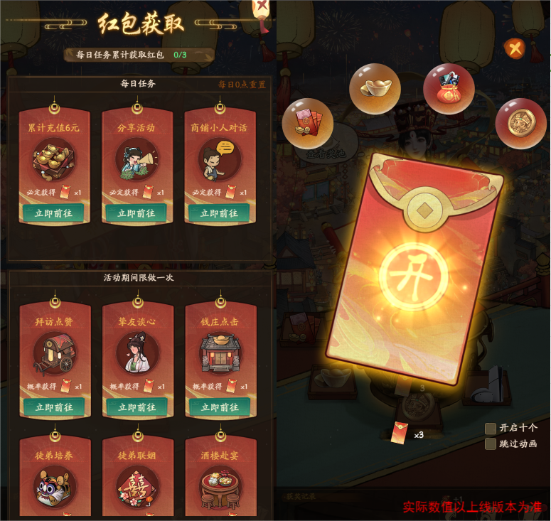 新春红包大放送,春节期间将有多种途径获取春节限定道具“新春红包”。