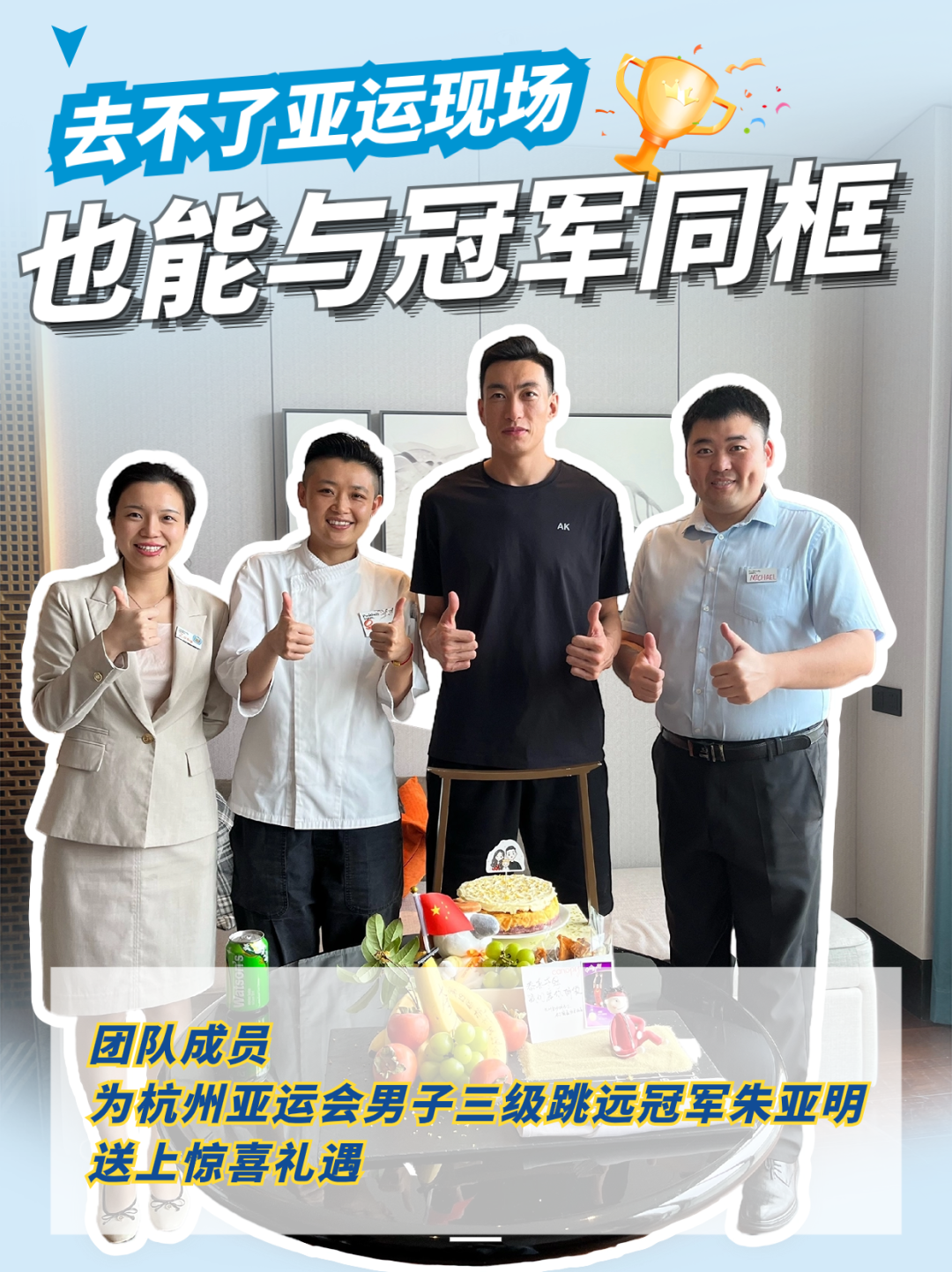 虽然无法亲临比赛现场为运动员呐喊助威,众多坚守在接待一线的团队成员将自己对亚运的热爱和支持带到工作中。杭州金沙湖和达希尔顿嘉悦里酒店的团队成员们在得知田径运动员朱亚明先生获得男子三级跳冠军后,为他精心准备了惊喜礼遇,共襄夺冠喜悦。