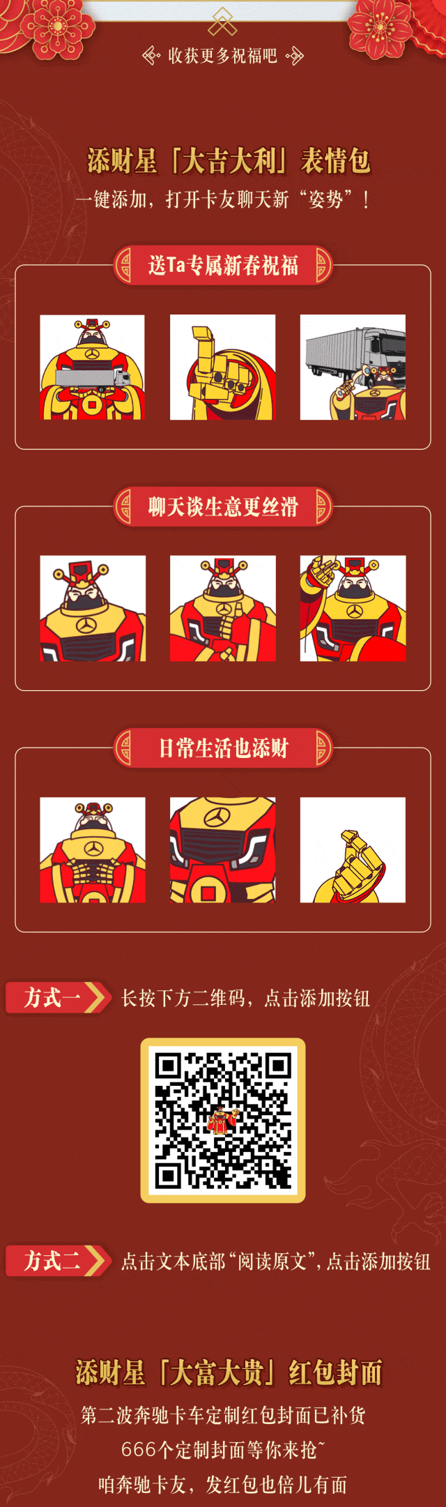 摘要:奔驰卡车大礼包:表情包+第二波红包封面+新春三件套,速领!