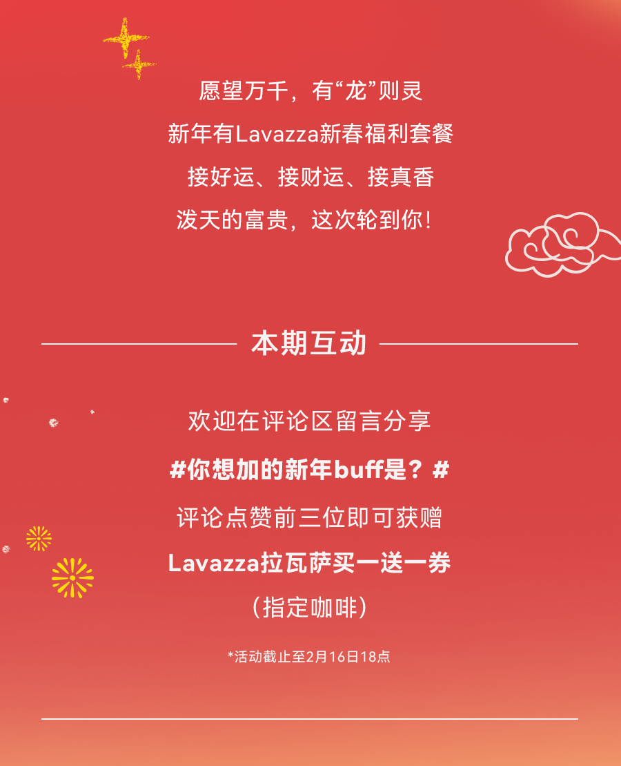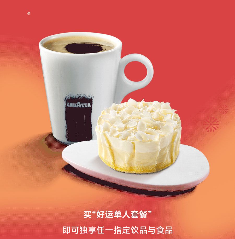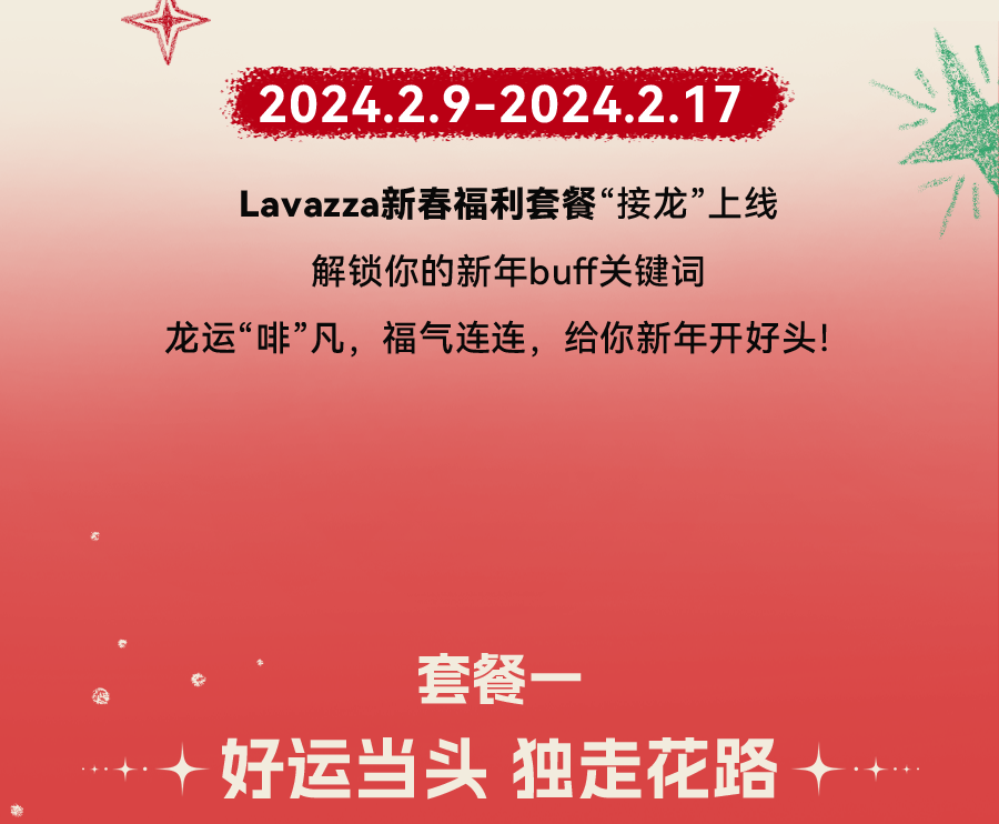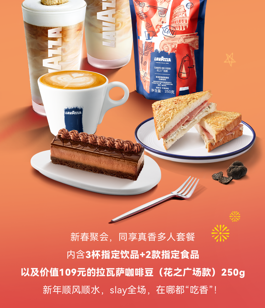 活动时间:2024年02月09日至2024年02月17日,如活动产品售完,则本活动提前结束;活动时段:7:30-22:00;具体情况以门店实际为准;活动区域:全国门店;不适用于Lavazza北京首都店和Lavazza Lobby店;活动渠道:堂食扫码,到店自取,支付宝小程序,微信小程序,小程序外送;好运单人套餐,套餐含:指定饮品1份及指定食品1份,饮品可选:龙须酥芝麻拿铁-标、海棠花香乌龙拿铁-标、水牛乳清甜拿铁-标、海盐橙花味水牛乳拿铁-标、海棠花香乌龙轻乳茶-大、KAFA鲜奶拿铁-标、KAFA美式-标、路易波士茶拿铁-标;食品可选:牛乳双重芝士蛋糕、浓醇巧克力蛋糕、拉瓦萨提拉米苏、告白千层可颂两只装、潘妮托妮甜品组、牛肉菌菇可尼朵卷、火腿蛋鲜蔬可尼朵堡、滋味金枪鱼鲜蔬可颂、艾米利亚风情三明治、艾米利亚风情黑松露火腿三明治;真香多人套餐,套餐含指定饮品3份、指定食品2份及拉瓦萨咖啡豆(花之广场款)250g 1份,套餐共限量1008份,如活动产品售完,则本活动提前结束;饮品可选:龙须酥芝麻拿铁-标、海棠花香乌龙拿铁-标、水牛乳清甜拿铁-标、海棠花香乌龙轻乳茶-大、海盐橙花味水牛乳拿铁-标、鲜奶拿铁-标、KAFA美式-标、路易波士茶拿铁-标、宾得宝含气饮料(蜜桃汁风味/粉红葡萄柚汁风味);食品可选:牛乳双重芝士蛋糕、浓醇巧克力蛋糕、拉瓦萨提拉米苏、告白千层可颂两只装、潘妮托妮甜品组、牛肉菌菇可尼朵卷、火腿蛋鲜蔬可尼朵堡、滋味金枪鱼鲜蔬可颂、艾米利亚风情三明治、艾米利亚风情黑松露火腿三明治;本活动优惠不与其他优惠共享。产品及包装以实物为准;本活动仅限有此产品供应的LAVAZZA门店,具体请以门店餐牌公示为准;不同LAVAZZA门店的服务时间有所差异,具体请以门店实际营业时间为准;如需外送服务需另行支付包装费和外送费,若您的送餐地址不在送餐范围内,我们将无法为您提供外送服务,敬请谅解;如有疑问,请至LAVAZZA微信小程序在线客服咨询。