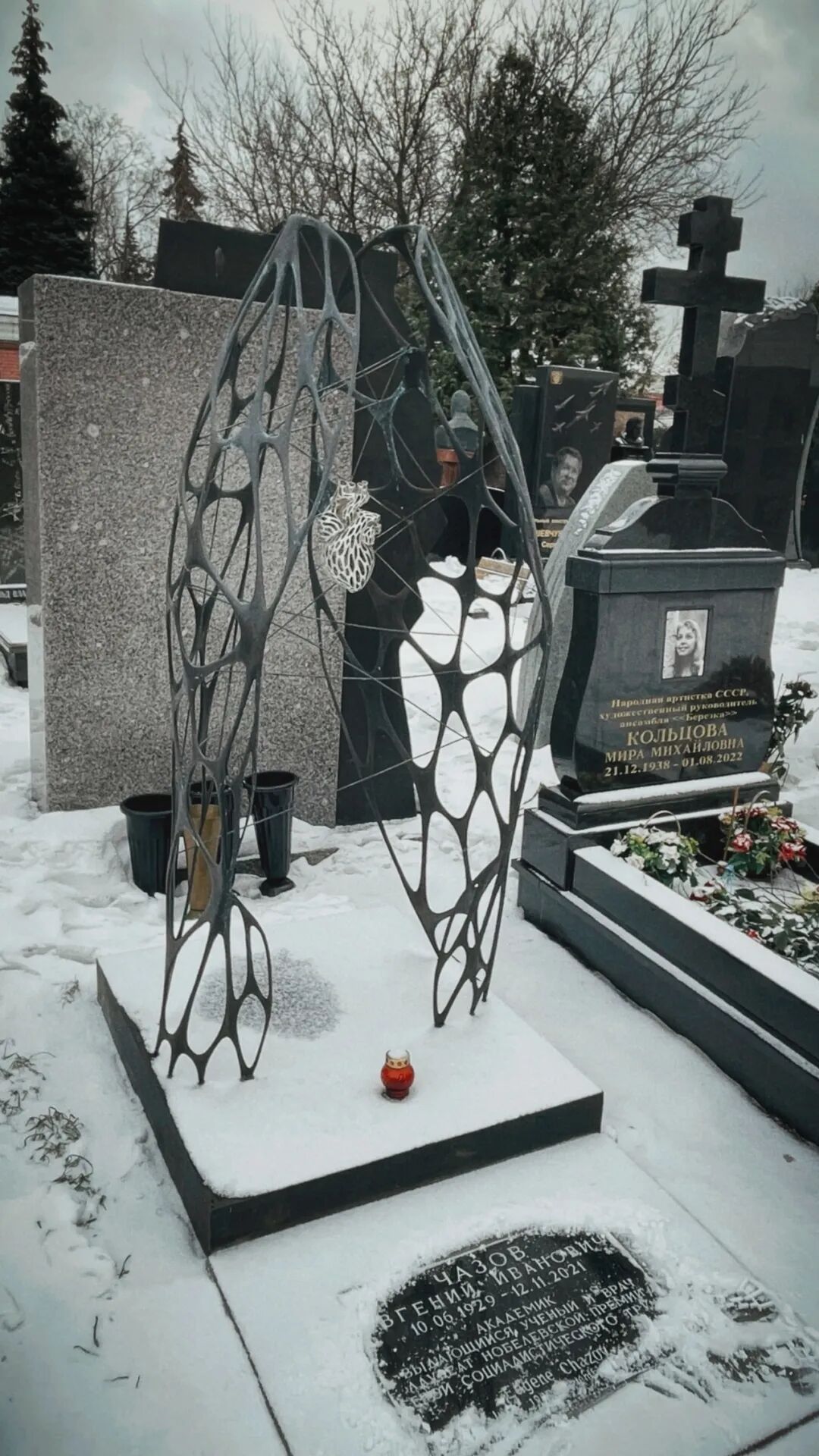 步行5公里去往新圣女公墓。雪后寂静,一排排走过雕像样的碑,喜欢一个抽象的、一人高的——两片肺,中间悬空着心脏,金属材料——12.06.1929至12.11.2021,是位医生。去除了面庞,躯干,看到心。