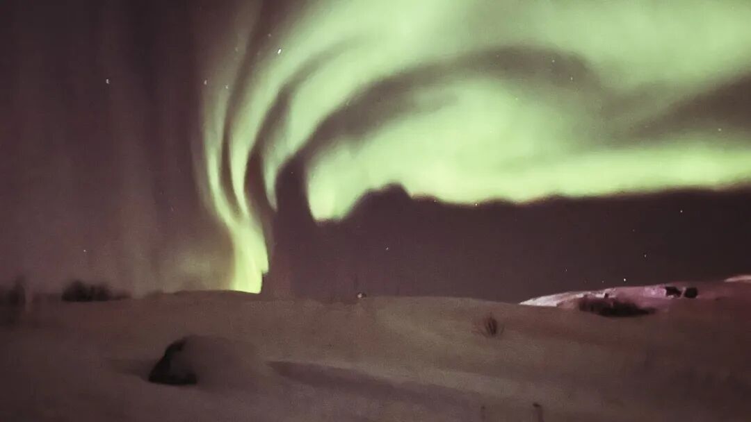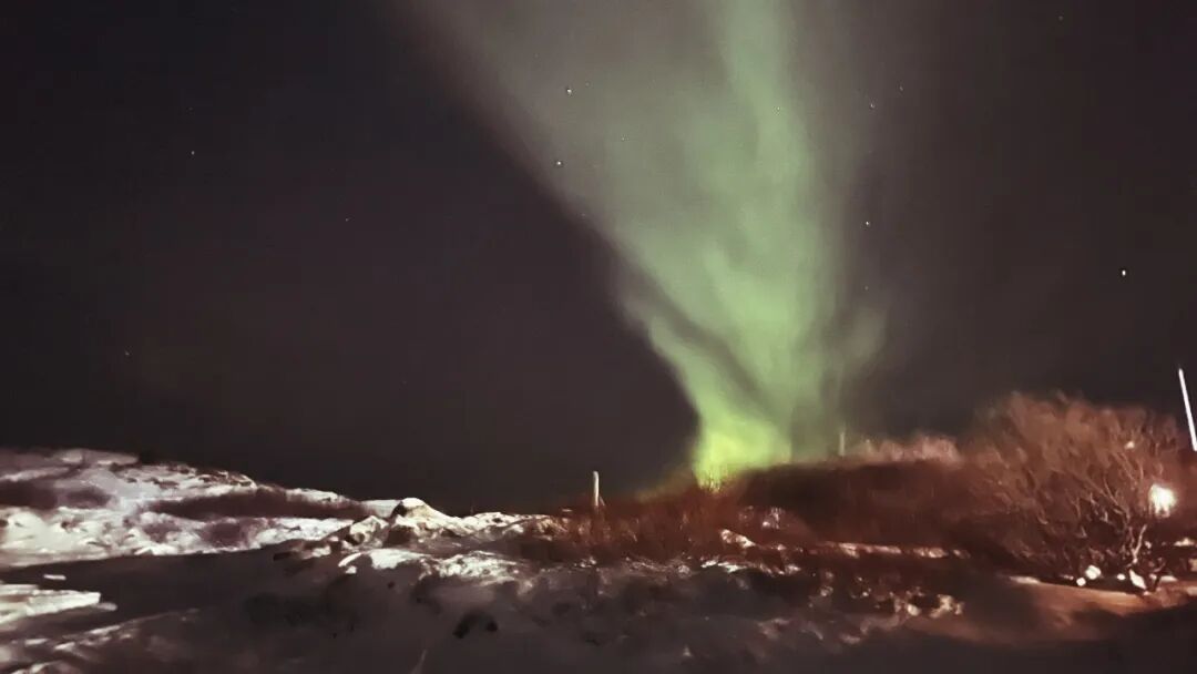 追光APP提示当天的极光指数颇高;晚9时,它来了。旅伴发来消息提醒,他在外面蹲守了半小时多,而我躲在木屋,不太积极。“如果执意进城赶班车,那极光出现的时候还在路上。”关于这些我没有讲。