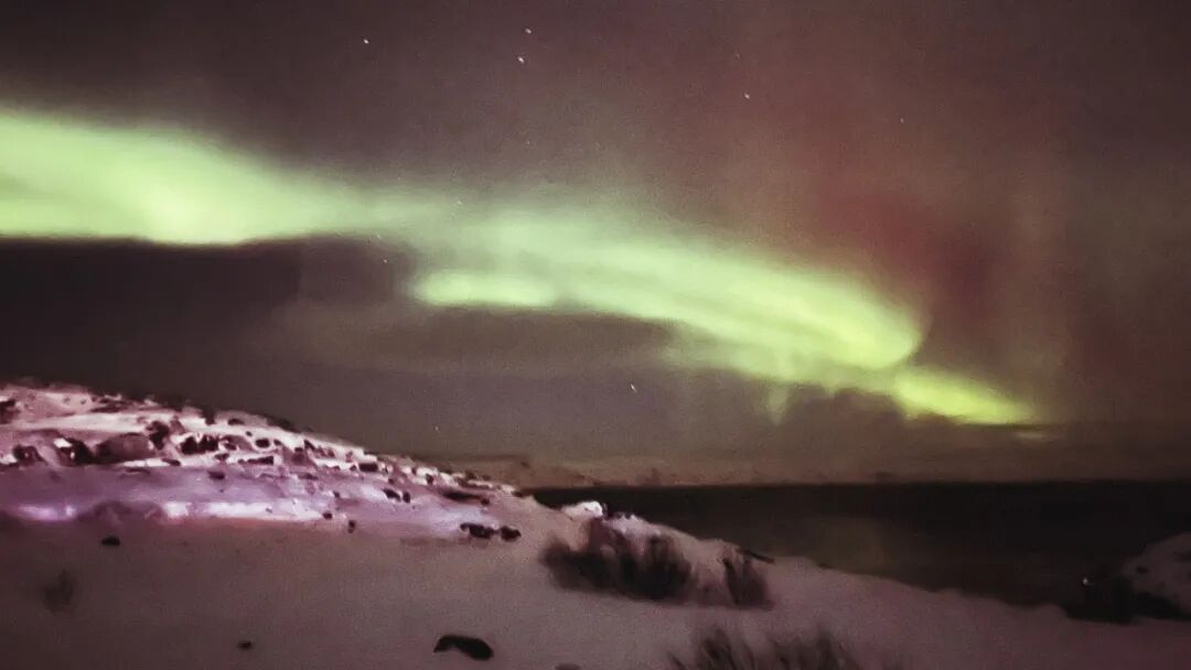 出门与他会合,在巴伦支海边的小坡上,下面是峡湾。看到了,荧光绿辅以绛紫色打底,是流动的光。