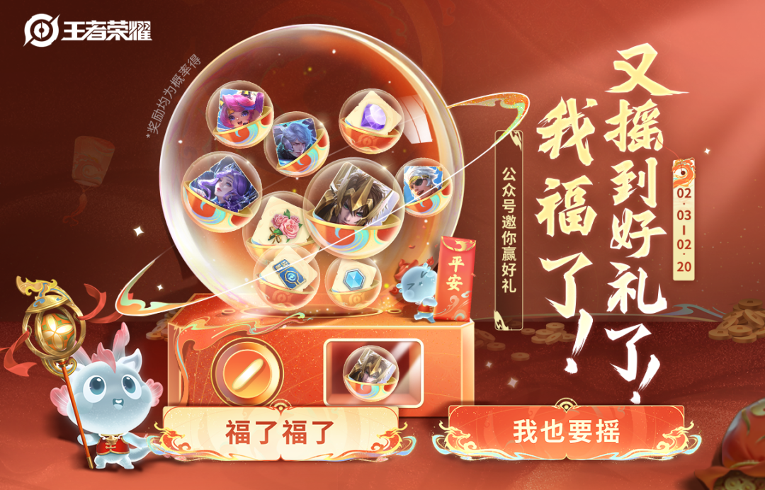 龙年到!好礼到!妲己宝宝有自己的拜年方式——春节限定摇奖机来啦!快来参与摇一摇参与赢好礼,看看你的龙年手气如何~