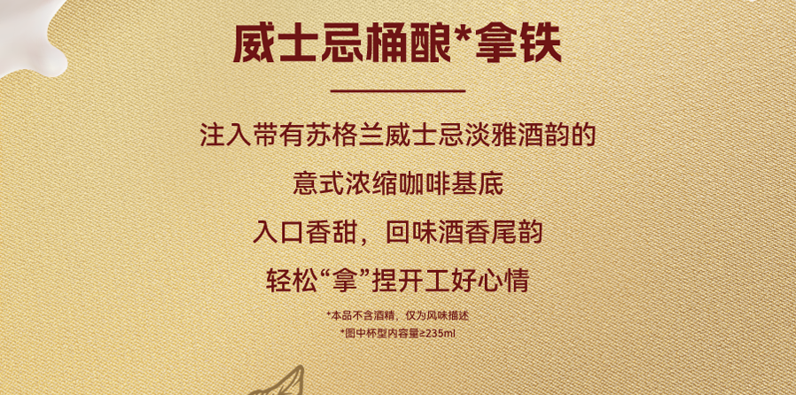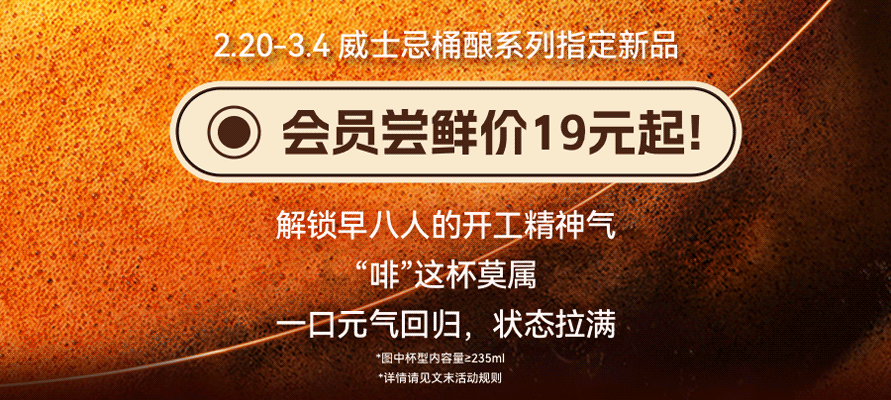 凭本券购买桶酿系列饮品(可选:威士忌桶酿*巧克力味拿铁(热)-巨匠小杯、威士忌桶酿*拿铁(冷/热)-巨匠小杯、威士忌桶酿*美式(冷/热)-巨匠小杯)1杯,可享立减5元优惠;