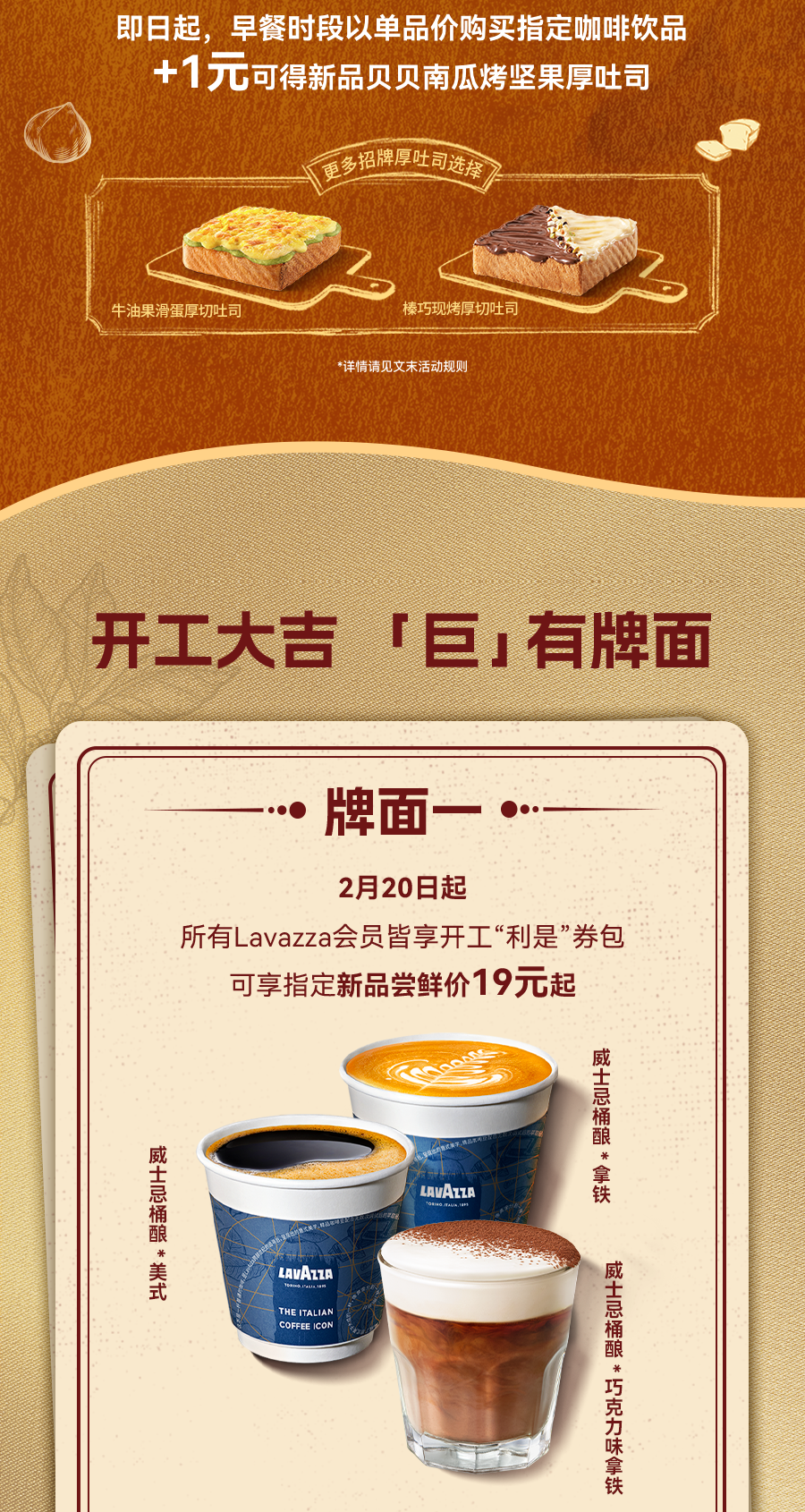 即日起, 在Lavazza小程序(包含微信及支付宝小程序)点餐时,以菜单单品价点购指定饮品一杯,可享加1元、或3元、或5元、或7元得指定小食1份。可选指定饮品及可选指定小食范围请以点餐时各咖啡店餐牌公示及小程序页面内容为准。本活动仅限早餐时段7:00-10:30可享,且仅限在门店服务时间段内供应,具体请以门店实际营业时间为准。使用Lavazza小程序外送点单时,仅限LAVAZZA外送服务送餐范围及服务时段,不同送餐区域的服务时间有差异,详情以输入送餐地址后显示的菜单及送餐时间为准。包装费及外送费需另行支付。 产品及包装请以实物为准。如有疑问,请咨询LAVAZZA小程序在线客服,服务时间:9:00-21:00 。