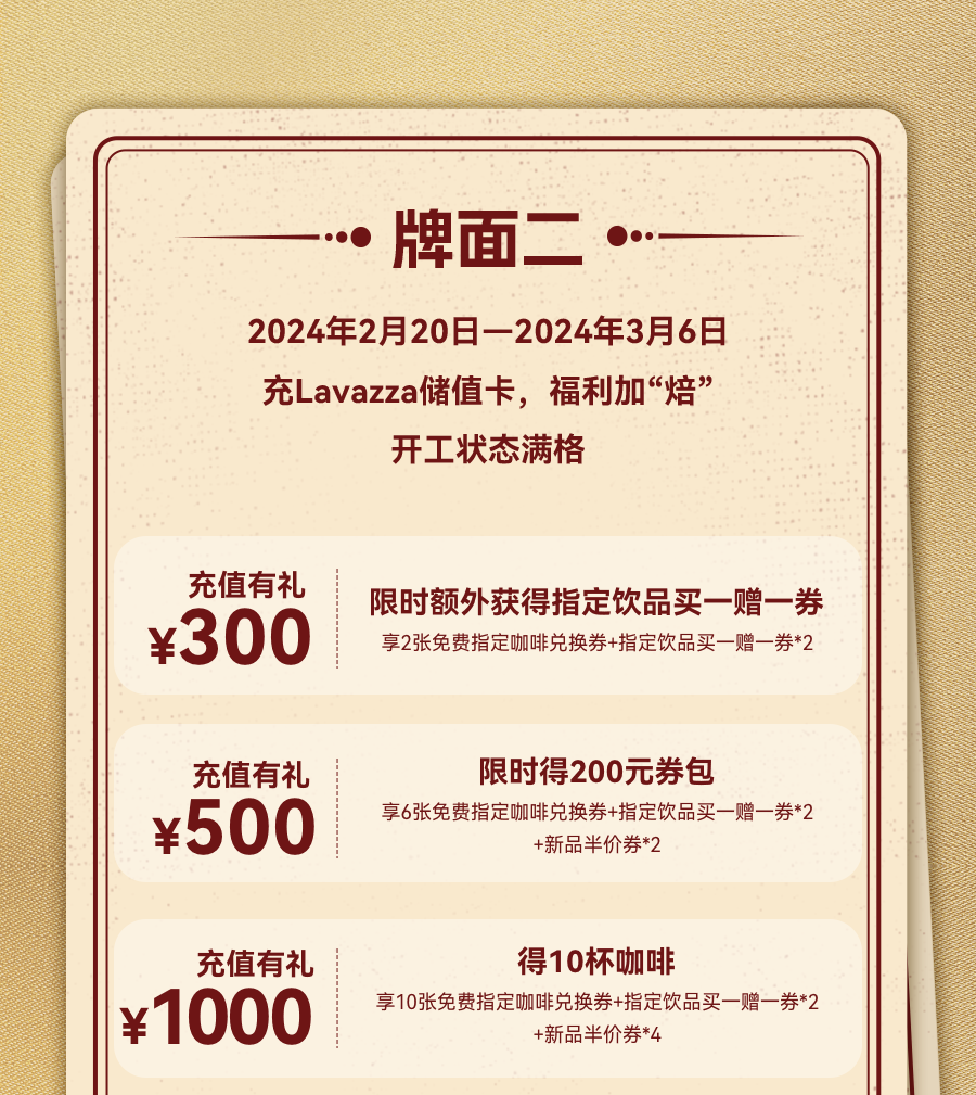 1. 点击LAVAZZA小程序【我的-我的钱包】一次性充值300元可获得2张免费指定咖啡兑换券和2张指定饮品买一赠一券。一次性充值500元限时可获得6张免费指定咖啡兑换券、2张指定饮品买一赠一券和2张指定当季饮品半价券。一次性充值1000元可获得10张免费指定咖啡兑换券、2张指定饮品买一赠一券和4张指定当季饮品半价券。每单仅限使用一张兑换券或者优惠券;兑换券和优惠券不与其他优惠共享。具体使用规则请见“我的卡包”券说明。