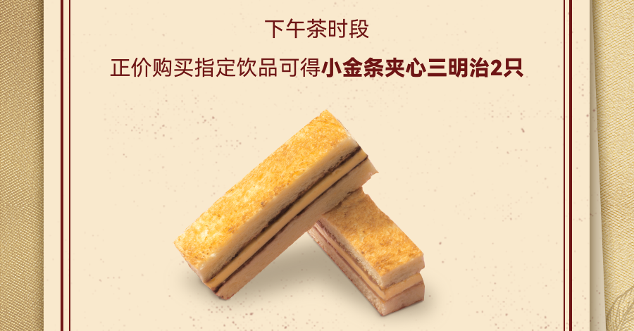 凭本券以单品价购买指定标杯饮品:(可选:水牛乳清甜拿铁(冷/热)-标、KAFA美式(冷/热)-标、威士忌桶酿*巧克力味拿铁(热)-巨匠小杯、路易波士茶拿铁(冷/热)-标、海棠花香乌龙鲜乳茶(冷/热)-标、沁摇鲜柠乌龙茶(冷)-标),即可得小金条夹心三明治2条1份;